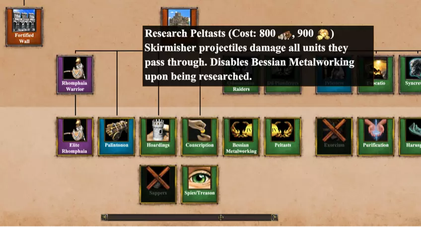 斯巴达与凯尔特科技树对比:两者极为相似! 乍看之下,《编年史:亚历山大大帝》似乎与《帝国时代2:决定版》是两款截然不同的游戏。诸如“链锤兵”“禁卫步兵”“枪骑兵”和“层压弓兵”等单位,乍看之下仿佛是需要重新学习的全新单位。但幸运的是,这些单位只是常规基础游戏单位的古代版本,通过重命名和重新建模,旨在增强《编年史》古代背景的沉浸感。 它们的属性、成本、加成等与《帝国时代2:决定版》中的对应单位完全一致——链锤兵与“双手剑士”属性相同,层压弓兵对应“弩手”,而枪骑兵则是古代版的“骑士”。虽然我们已引入其他具有完全独特角色的单位,例如重装步兵(Hoplite)和方阵兵(Phalangite),但这套核心单位将使《编年史:亚历山大大帝》(Chronicles: Alexander the Great)极具易上手性和趣味性! 我们在科技方面也融入了这一主题,提供全新图标和名称以让你沉浸于古代世界,但其成本和收益保持不变。甚至你的热键功能也完全相同! **双倍独特科技——重玩价值与战略深度并存!**