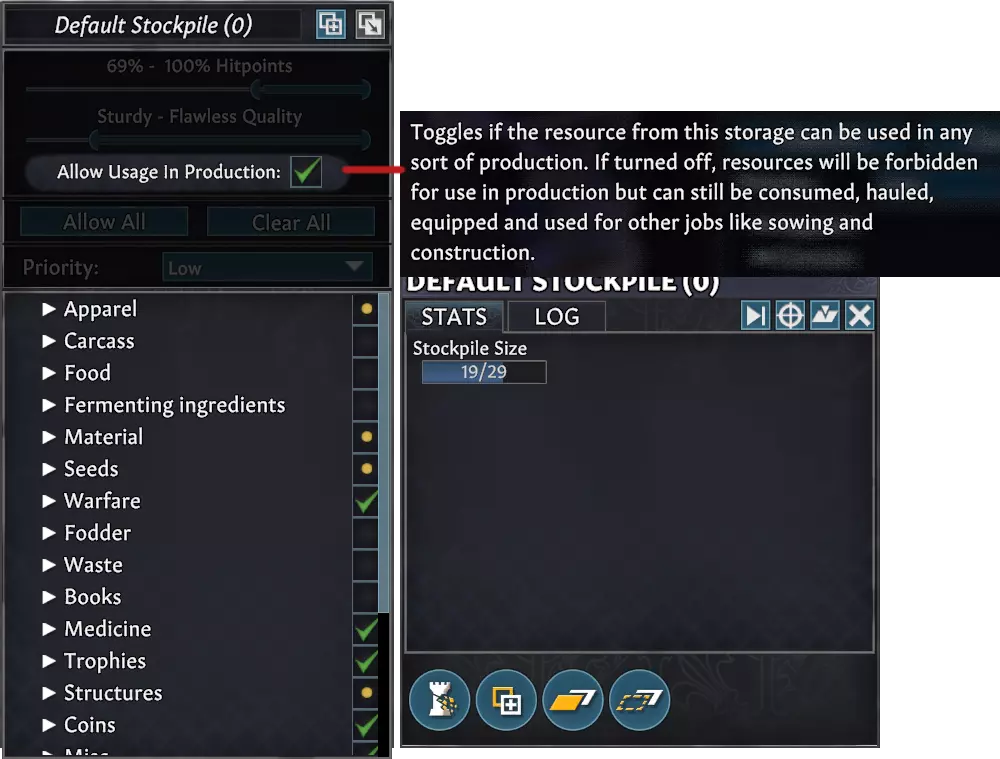 另一个大家频繁请求的功能是在库存/货架面板中添加“允许用于生产”的勾选框。取消勾选后,定居者将在生产时忽略这些存储中的资源。