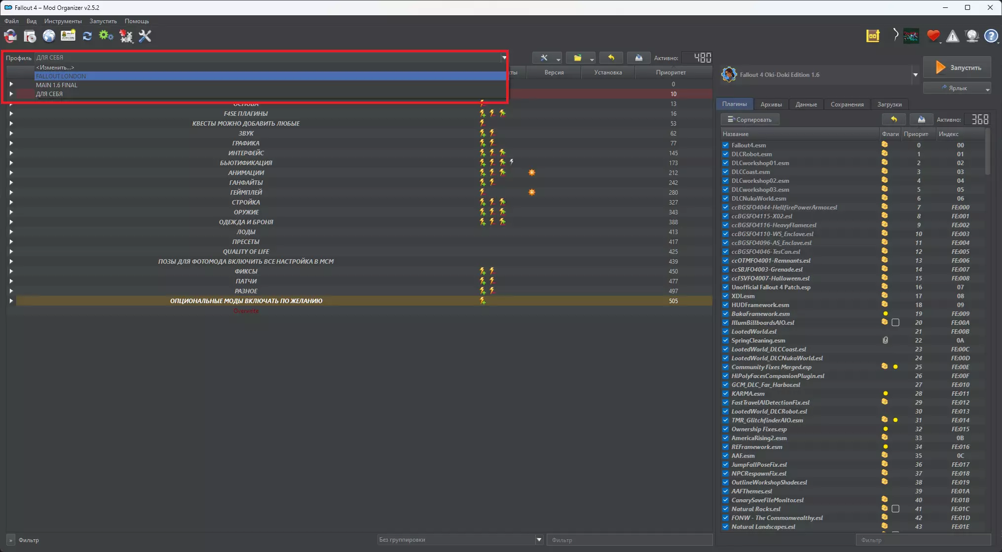 常见问题解答 其他所有问题请前往DISCORD咨询![discord.gg] - 如果你使用的是超宽屏显示器: 1. 启用**宽屏显示器支持模式**。 **重要提示!** 如果你已设置好分辨率,但屏幕仍然拉伸,请在Windows设置中将缩放比例调整为100%。 - 什么是Modern Addon以及如何启用它? Modern Addon是《辐射4》Oki-Doki Edition 2整合包的扩展组件。该插件为游戏添加了现代装备和武器,并且游戏中的NPC也会装备这些物品。 当然,此插件与游戏的背景设定(ЛОР)相悖,请注意这一点。 插件包含以下内容: - 约45种新型现代武器, - 数百种新装备和服装, - 先进的服装物理效果, - 全新的哔哔小子(Pip-Boy), - 各种新动画。 安装方法: 在MO2(Mod Organizer 2)的配置文件部分,选择“MAIN 2.3 + MODERN ADDON”。请参考截图!