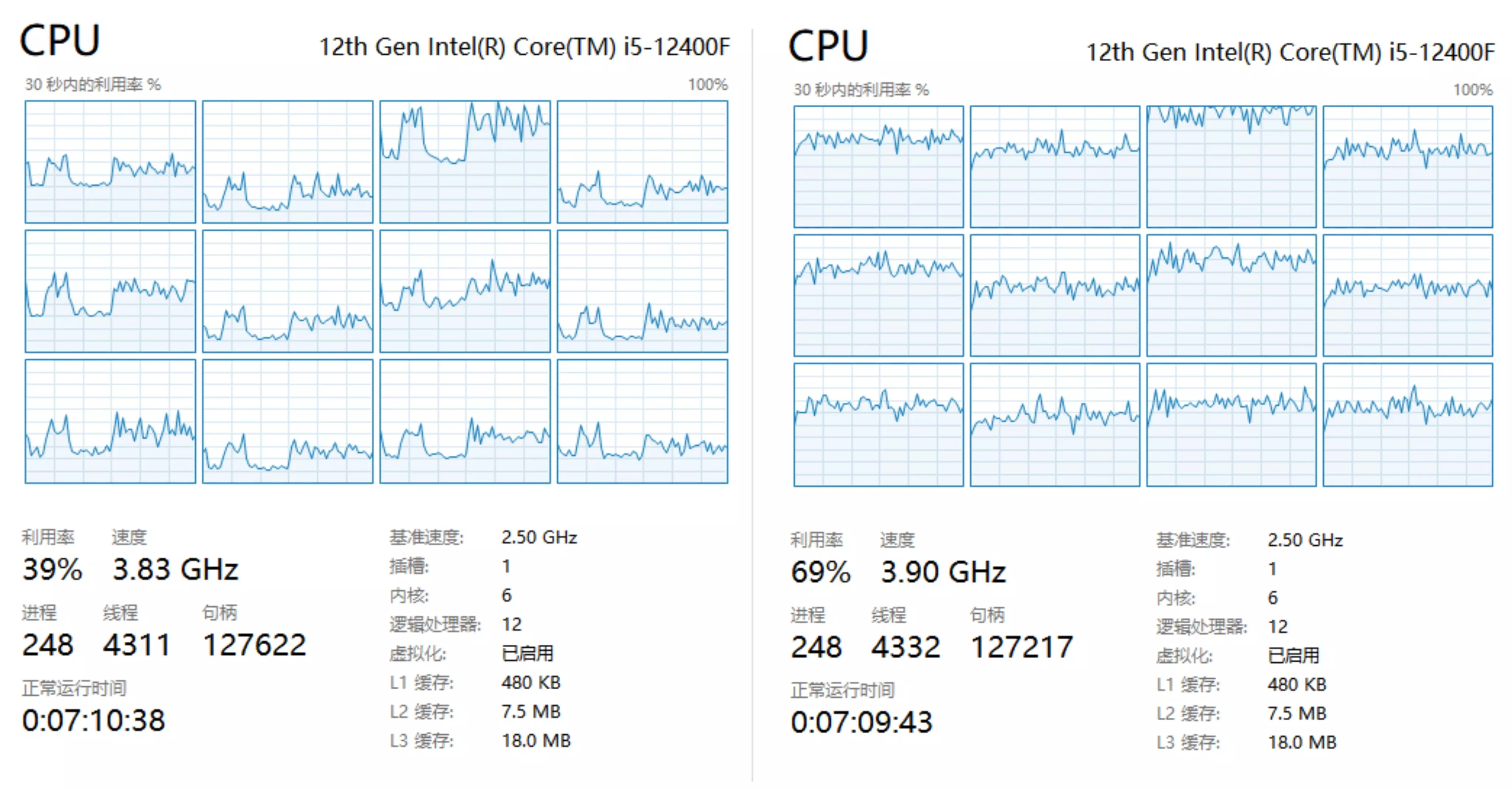 复杂场景下的CPU利用率对比:Mono版本(左)与DOTS版本(右)