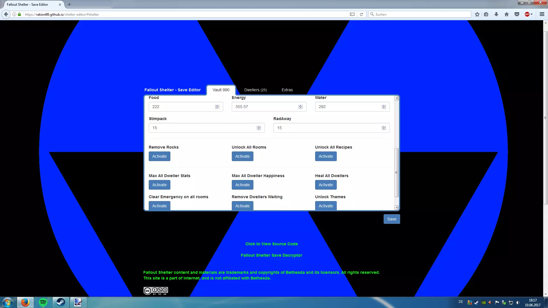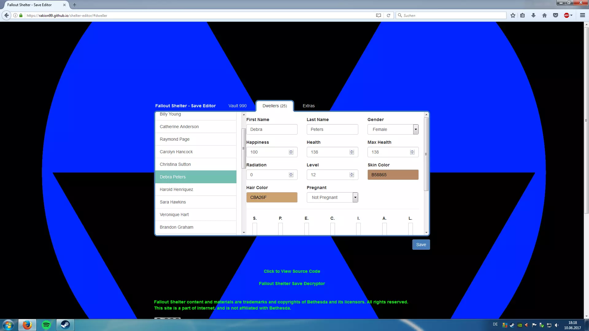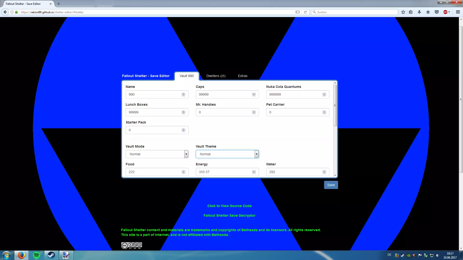 现在要编辑你的文件,只需点击链接并拖放你的Vault{1,2或3}.sav文件即可! 存档编辑器 [rakion99.github.io] 你可以编辑所有内容,包括瓶盖、核子可乐量子、午餐盒、巧手先生、食物、水、电力,甚至可以编辑居民的等级、S.P.E.C.I.A.L属性,还能解锁所有房间、清除所有岩石、治疗所有居民等等。有很多内容可供你编辑!尽情享受修改的乐趣吧!