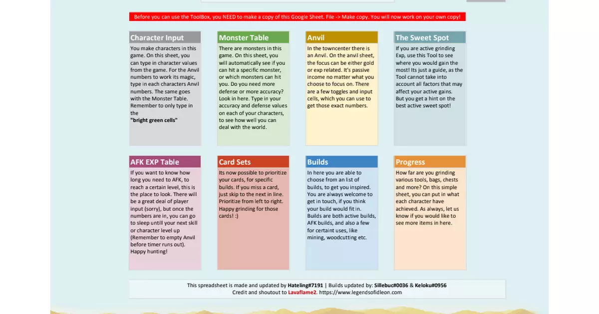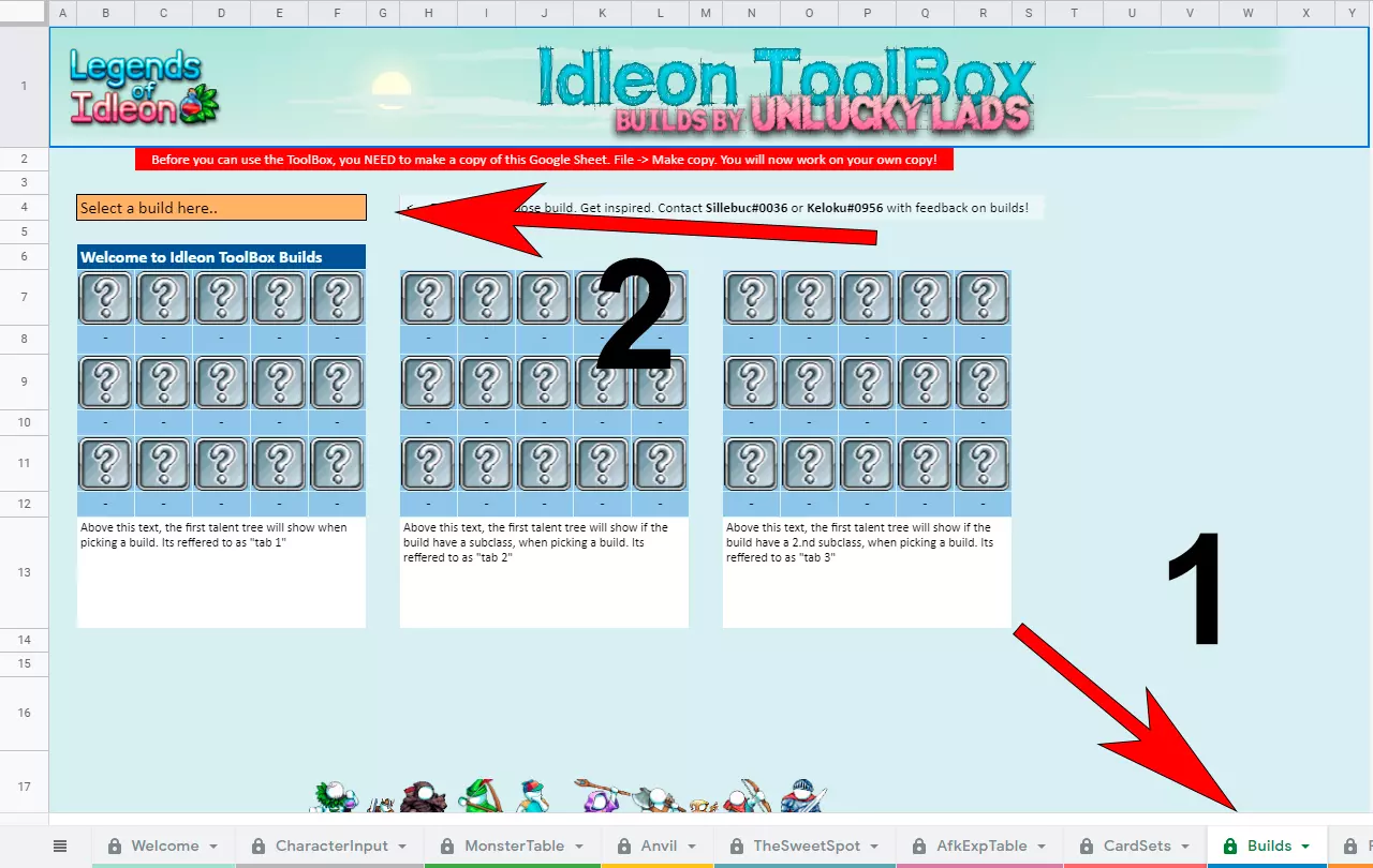 你可能会希望你的第三和第四个角色在专注于专精之前,通过击杀敌人来大幅提升等级。 准备并击败Boss Amarok 世界2 | 美味沙漠 Builds - 我该如何构建角色? 有两个主要地方可以查看Builds。 在Idleon Toolbox中,有一个由顶尖玩家Keloku和Sillebuc制作的包含最佳Builds的表格:Idleon Toolbox[docs.google.com]