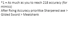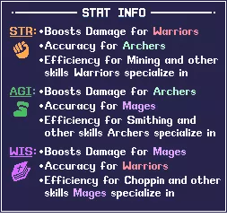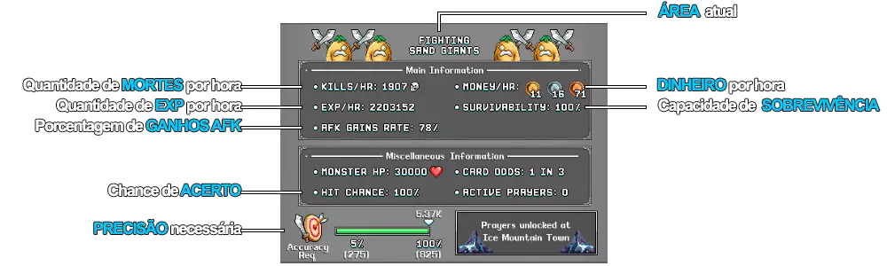 *1 = O tanto quanto você precisa para atingir 218 de precisão (para mímicos) Depois de corrigir a precisão, priorize Sharpened Axe>Guilded Sword>Meatshank. As builds de nível 35 dizem para você investir ponto para ter 218 de precisão para farmar nos mímicos, as de nível 50 para você investir para ter 405 de precisão para farmar nos Sand Castle e as de nível 70 para ter 825 de precisão para farmar nos Sand Giants. Mas e se eu for de nível menor que 35? Devo investir até ter 218 de precisão? A resposta é não! Fazendo isso você vai acabar gastando todos os seus pontos em precisão e ficando sem todo o resto, você deve investir em precisão conforme o quanto for necessário para a zona em que você deseja ficar afk, então se por exemplo você ainda não chegou nos mímicos e está nos Slimes, então invista para conseguir precisão necessária para os Slimes e o resto em dano conforme a build, após isso consiga mais nível, libere a próxima área e invista para conseguir a precisão necessária para o inimigo da próxima área, que seriam as cobras (Baby Boa), e invista o resto em dano conforme a build mostra. FAQ das BuildsP: "Como posso resetar meus pontos de talento para poder realocar?" R: O NPC Promotheus dará a cada personagem uma poção de reset de pontos e alguns fragmentos que você pode juntar 10 e formar a poção de resetar, você pode comprar mais fragmentos de cada loja do jogo diariamente. Portanto, não se preocupe em experimentar builds. P: "Resetei meus talentos, segui a build e agora eu estou ganhando menos XP por hora, por quê?" R: Você provavelmente esqueceu de equipar seus ataques na sua barra de habilidades, se não for isso você provavelmente não tinha pontos suficiente para seguir a build e acabou investindo na ordem errada. P: "Faço build AFK ou Ativa? No meu personagem principal, que é o que eu mais uso, eu deveria fazer build Ativa, certo?" R: Na maioria dos casos você deve fazer build AFK em todos os seus personagens incluindo o seu principal. O motivo é que com build AFK você vai conseguir XP, ouro e drops de maneira mais fácil, já que para superar o ganho de XP de uma build AFK usando uma build Ativa você teria que deixar seu jogo aberto no personagem com o "AUTO" ligado, o problema é que depois você provavelmente vai fechar o jogo e ir dormir ou fazer outra coisa, nisso o seu personagem vai estar AFK; acontece que num geral seu personagem vai ficar mais tempo AFK do que Ativo, por isso uma build AFK geralmente vai cair melhor para farmar XP do que uma build Ativa. P: "Em que situação eu devo fazer uma build ativa?" R: P: "Por que não investir em STR para Warrior, AGI para Acher e WIS para Mage nas builds de combate?" R: Acontece que investir nesses talentos só bonifica realmente as especializações (Mining para Warrior, etc), dano é muito mais forte vindo de "Weapon Power". P: "Estou fazendo um misto de combate e profissão, é uma boa?" R: Misturar dps e habilidades é geralmente bem ruim, pois você só pode fazer uma coisa por vez e misturando você não vai ser seu máximo em nenhuma delas. Baba Yaga the House Monster - Como encontrar e matar Baba Yaga é um chefe opcional que surge cada hora em ponto em Birch Enclave. Para chegar lá, entre no portal ao lado da árvore branca em Bored Beans. Entrei em Birch Enclave mas não vejo o minibossVocê pode tentar duas coisas: -Entrar no mapa 5 minutos antes de XX:00 e esperar até ela aparecer (pode demorar até uns 10 minutos). -Entrar no mapa pouco antes de XX:00, quando der XX:00 e ela não aparecer você pode ir em MENU>SWAP PLAYERS>PLAYER MENU e selecionar novamente seu personagem, se não funcionar você pode voltar para os feijões e reentrar no portal. Requisitos mínimos para matarBaba Yaga é um miniboss mais forte que o chefe do mundo, ela tem 400 de ataque e 150 mil de vida. Atualmente é necessário 450 de precisão para atingir 100% de chance de acerto, com 100 de defesa ela dá 366 de dano, com 200 defesa dá 266 de dano e com 466 de defesa dá 0. Porém você não precisa ter tudo isso de defesa para enfrentar, já que é possível você derrotar sem que ela te acerte, fora isso você pode usar poção que aumenta sua vida máxima e comida para recuperar sua vida. Já em questão de precisão...com 150 você tem 5% de chance de acerto e 450 para 100%, porém se tiver paciência suficiente você pode tentar com menos.