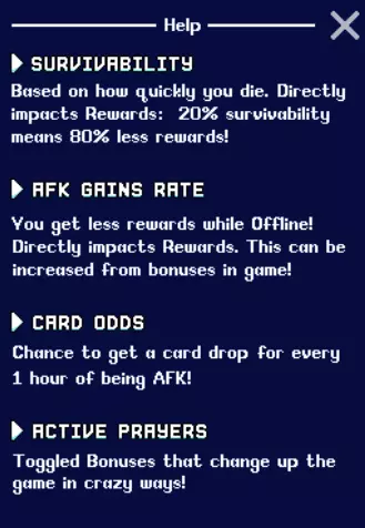 AFK收益会影响你的每小时击杀数/金钱/经验值,简单来说,60%的AFK增益意味着当你的角色处于AFK状态(不活跃/游戏关闭)时,你将获得你主动游戏(选择角色,无论是否开启“自动”模式)时所获收益的60%。 游戏开始时拥有100%的生存能力意味着你不会受到任何伤害,你可以通过提升防御力来增加这个百分比。