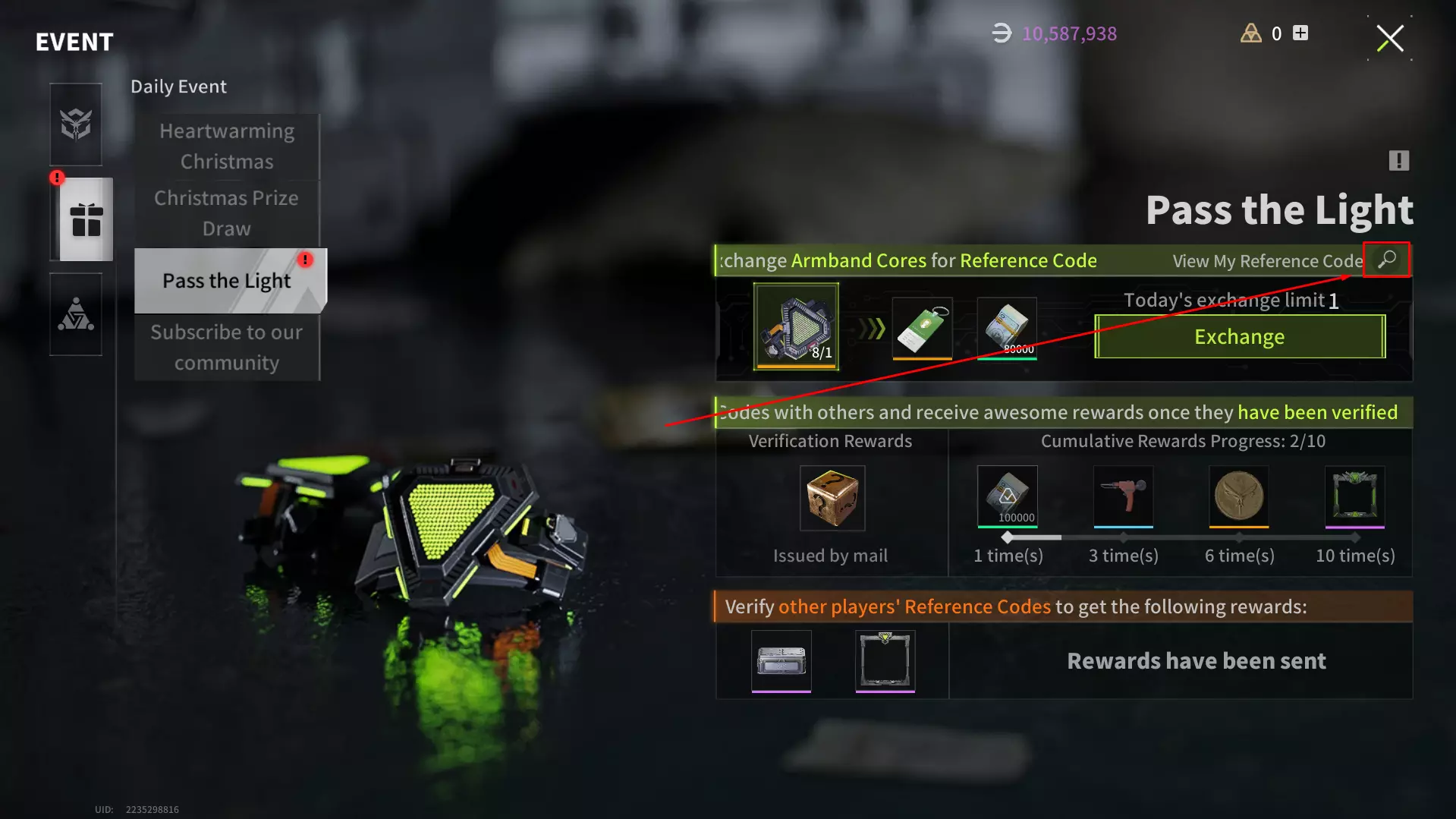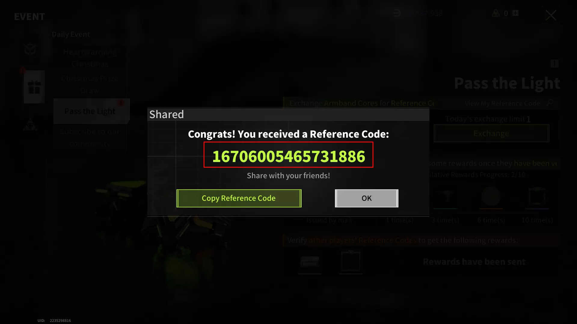 这是主要的推荐码和“传递光芒”活动页面,你可以在此获取推荐码、兑换推荐或使用推荐码所获奖励,以及在账户中使用推荐码。 获取推荐码请点击“兑换”按钮: (注意:如页面所述,即使你拥有臂章核心可生成更多推荐码,每日也只能生成2个推荐码。若要生成更多推荐码,请等待次日。)
