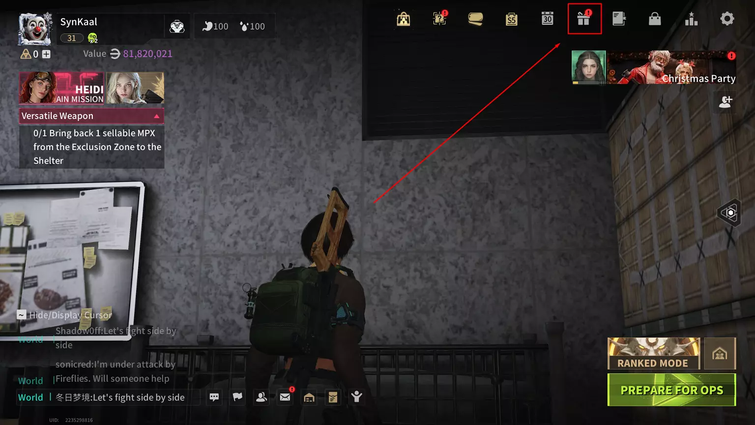 在成功搜刮并撤离(或未能撤离但安全箱内已有臂章核心)后,你需要前往“传递光芒”活动,将臂章核心兑换为可用的参考代码。 如果找不到该活动,请按照以下图片操作: 在主菜单中,点击活动图标进入活动页面。