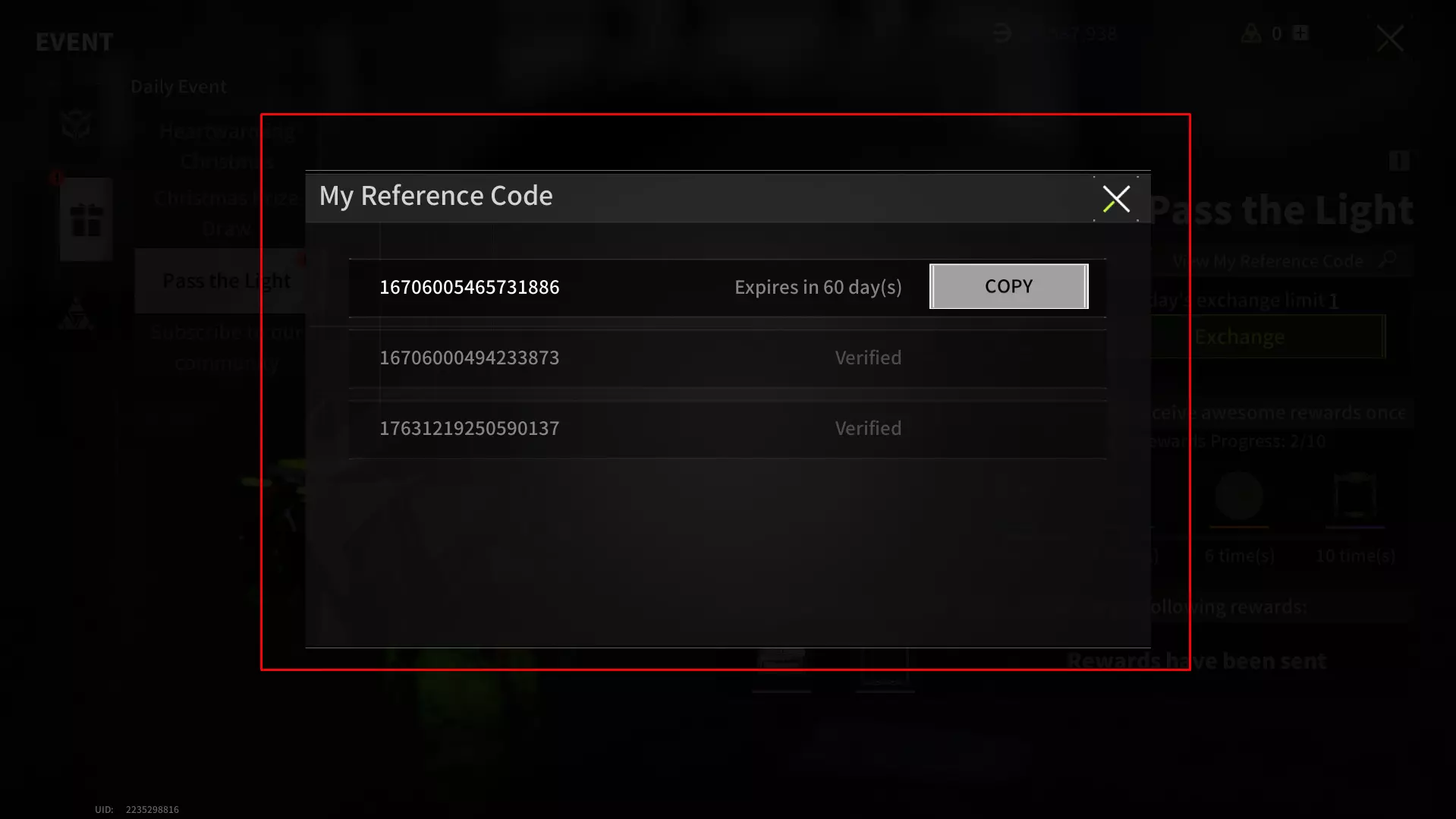 你可以复制并发送给他人以激活,从而获得“传递光明”相关奖励。若你需要再次查看自己的代码,或想了解哪些代码仍需激活,可点击放大镜图标。
