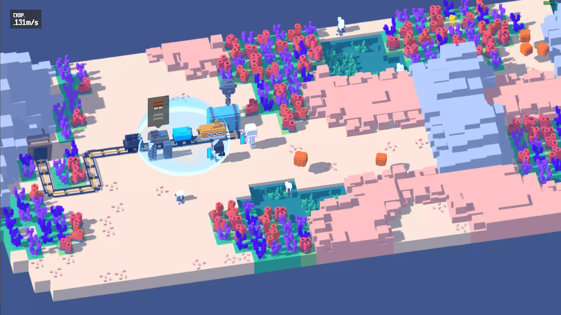 地图每次都会使用种子随机生成。不过在长期模式中,生物群系总是按照特定顺序依次出现,且每个生物群系都具备以下特征: - 用于获取木材的森林(或类似区域); - 含有铁矿的棕黄色或浅灰色岩石; - 阻碍移动的深灰色不可破坏岩石。铁路轨道只能铺设在坚硬的地面上,若没有坚硬地面,则需要建造木桥。 车站之间会出现用于升级火车的螺栓,此外每个生物群系中都有一个橙色的特殊零件。这些特殊零件相当于2个螺栓,是解锁最后一个 locomotive( locomotive)所需的物品。 在长期模式下,生物群系会在车站升级 locomotive( locomotive)后发生变化。 平原