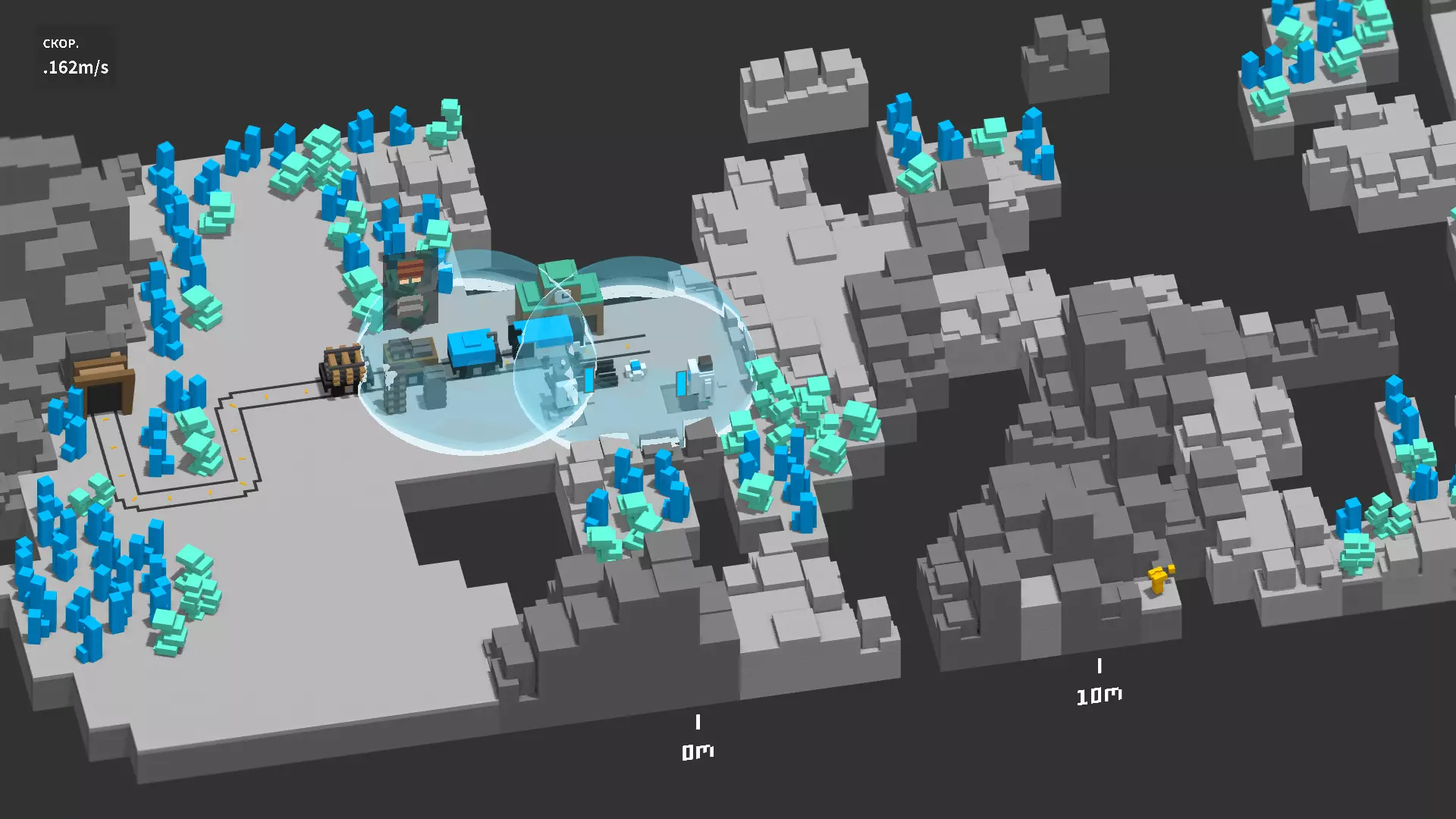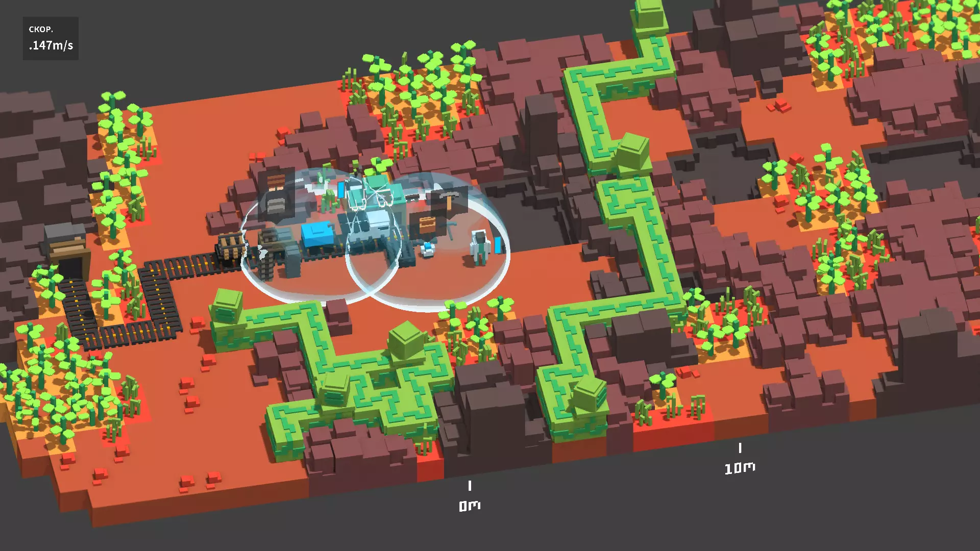 宇宙是一个由小行星带构成的生态环境。Unrailed corp 会向所有将铁轨直接延伸至宇宙的人免费发放飞行背包!现在是时候节省至少一半的桥梁费用了!飞行背包能让你在脚下没有坚实支撑的情况下,在小行星之间自由移动(前提是你已掌握操作方法(Unrailed corp 不对在宇宙中失踪的探险队负责))。连接小行星需要铁桥。 地表覆盖着灰色尘埃,会略微减缓移动速度。铁矿石在颜色上与不可破坏的山脉相似,而树木的位置则生长着各种蓝色晶体。 在真空中,火车不会发热,这意味着不再需要水——油罐和水桶现在构成了一个含有氧气的保护穹顶!除了缺氧之外,唯一的威胁就是坠落的陨石。它们在撞击时会摧毁任何表面并杀死建造者。必须用穹顶保护火车头和铺设好的铁轨。 宇宙中永远不会变暗,因此任何光源都毫无用处。而声音在真空中无法传播,所以火车头接近铁轨边缘的警告将无法被听到。经验之谈:通常最缺的就是金属,如果地图上有金属,那它的位置也总是很不方便。为了避免陨石坠落时造成损坏,只需把桶放在陨石下面就行了。 火星