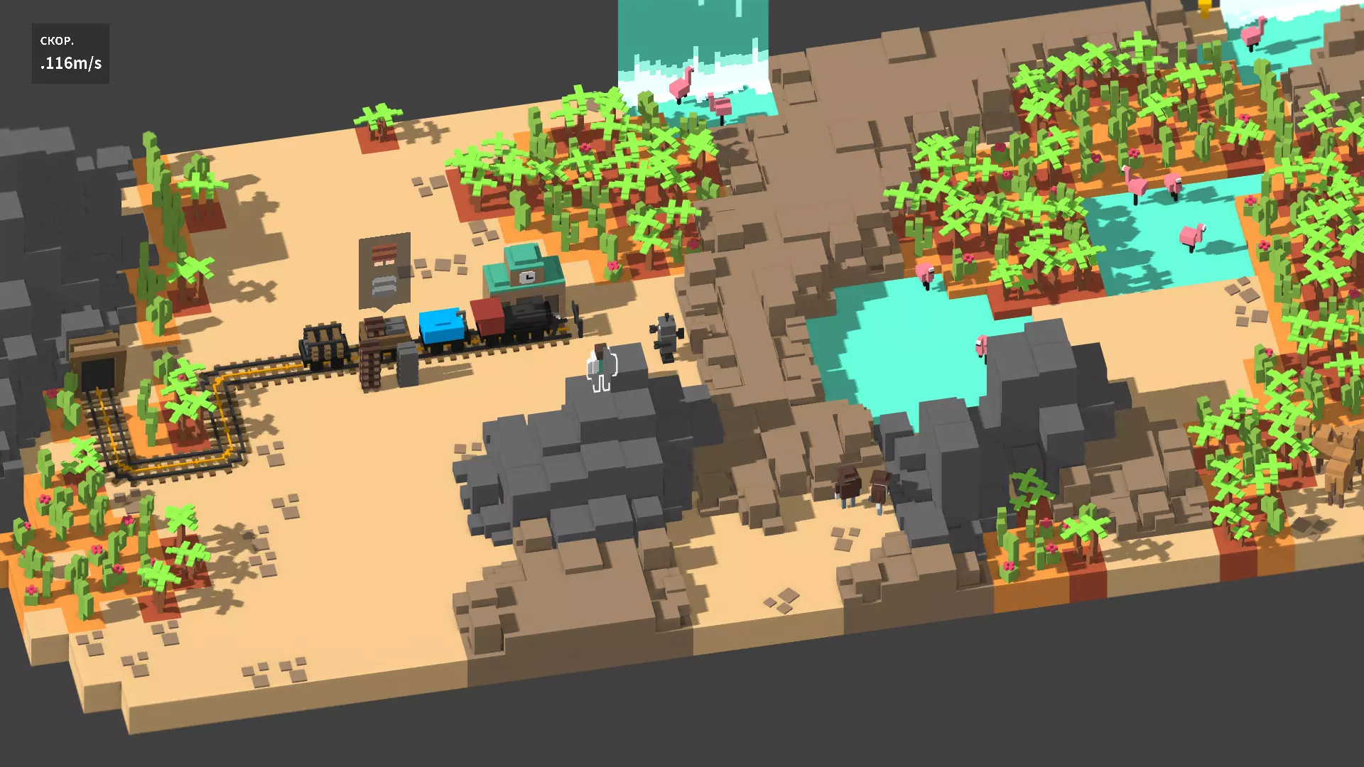 平原地区是草木茂盛的富饶田野,富含铁矿资源,部分区域生长着针叶林和阔叶林。这里湖泊常见,河流也遍布地貌,提供了充足的水源。 灰色的坚硬山脉基本不会阻碍火车通行。铺设轨道时应该不会出现问题。 偶尔会下雨,雨水会注满水桶和水箱,不过实际上基本没有这个必要。在游戏的生物群系中,你会遇到浮水的鸭子,以及那些总是冲到火车头车轮下的奶牛。如果配备了牛奶车厢,你就可以对奶牛进行残酷的剥削,但关键是不要在接下来的车站遇到“绿色和平组织”的代表。奶牛产出的牛奶能为玩家增添一股“大力士之力”,让他们只需一击就能开采铁矿和砍伐树木!如果玩家过于饥饿,或是想进行非传统的狩猎,就可以使用炸药将鸭子炸得羽毛纷飞。在猎杀第100只鸭子后,会有绿色和平组织代表团前来,授予英雄血腥成就Ducky Danger,并将其送上法庭。 若气象员宣布了“不幸周”,森林中就可能会出现小偷,而且是相当奇怪的那种。至今没有任何侦探能查明这些人的动机:他们偷窃地上的资源,然后直接扔进无尽的灰色深渊。幸运的是,小偷们害怕铁路工人,一有工人靠近就会试图躲藏。而那些格外残忍且记仇的建筑工人,可能会用斧头或鹤嘴锄攻击这些可怜又无助的小偷。希望在这之后,你不会在下一站被拦下。经验之谈:显然这是最简单的生物群系,但奇怪的是即便在这里也存在一些问题。高速移动时,可能会把山后面漂浮的浮标和螺栓搞混。或者忘记“不要伤害动物”的任务,却在浮标上架桥。奶牛几乎总是成群出现,可能会妨碍移动。 沙漠