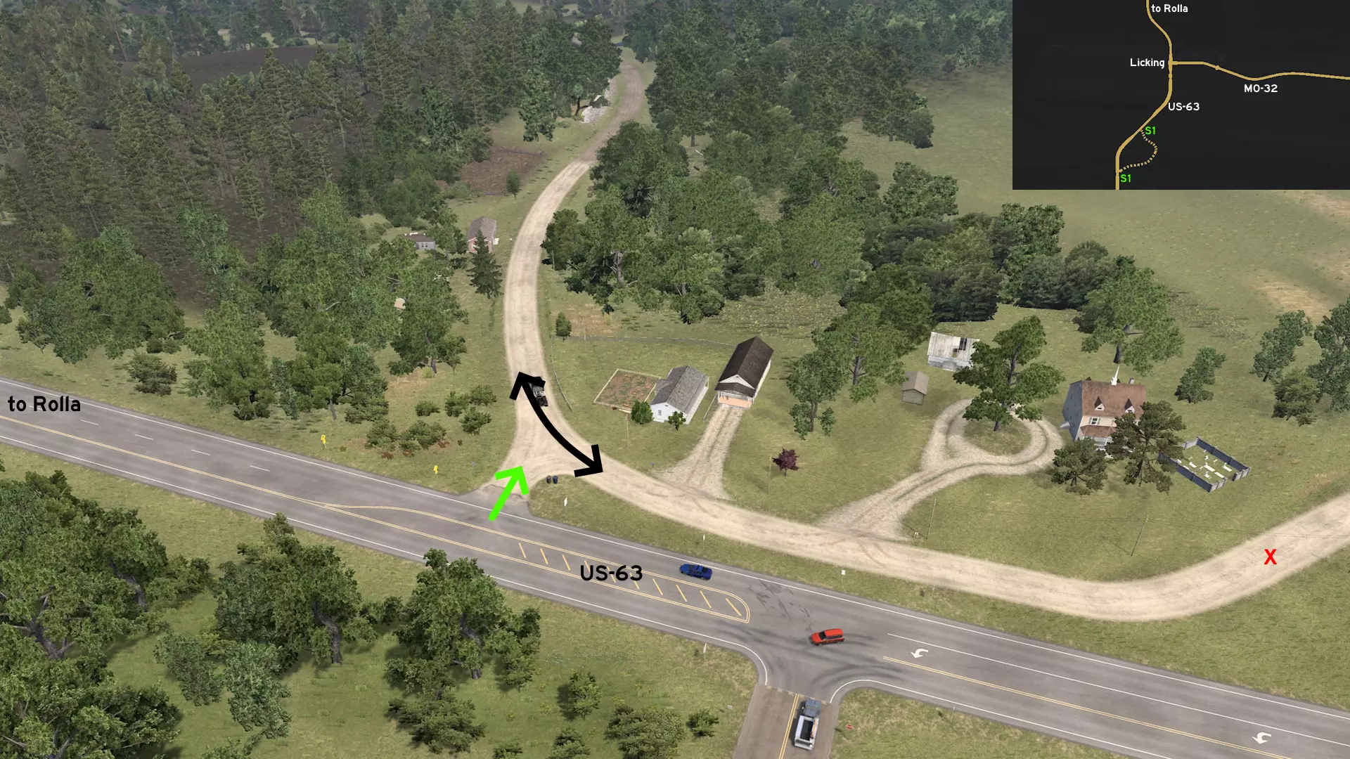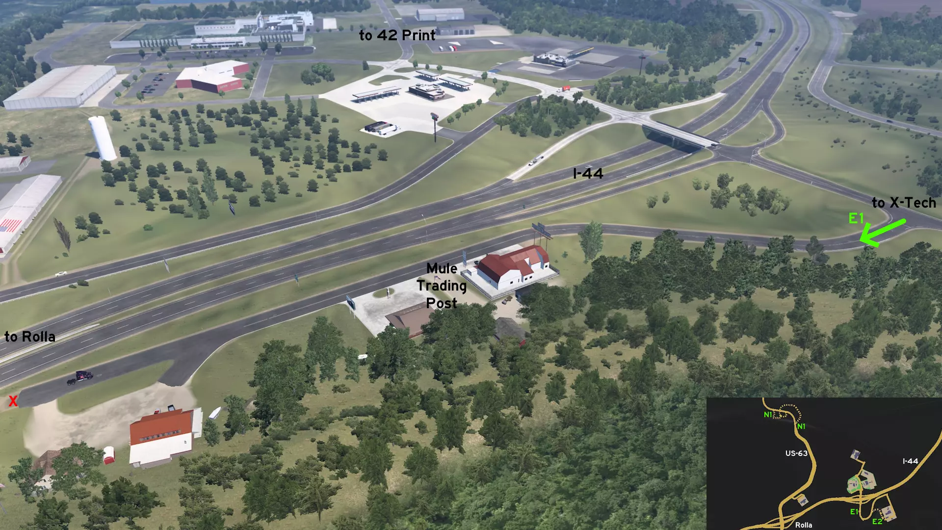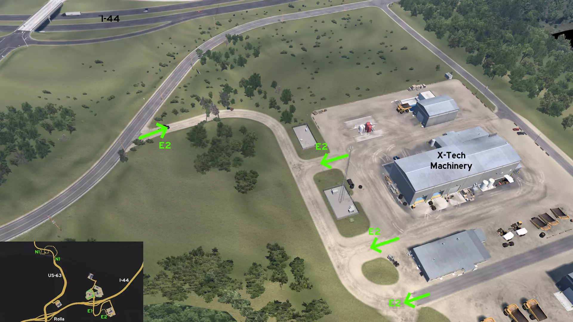 从罗拉东部出发,沿44号州际公路行驶。从出口前往X-Tech Machinery。不要一直沿着标记路线行驶到终点,在中途转入崎岖小路。小心驾驶,避免撞上散落在道路上的树枝,以免重蹈另一位卡车司机的覆辙。