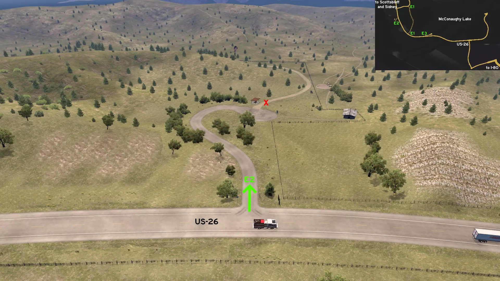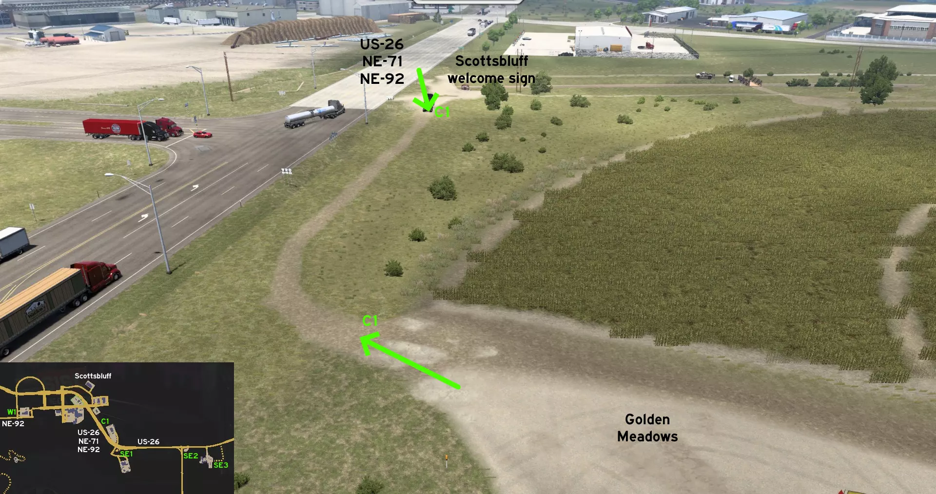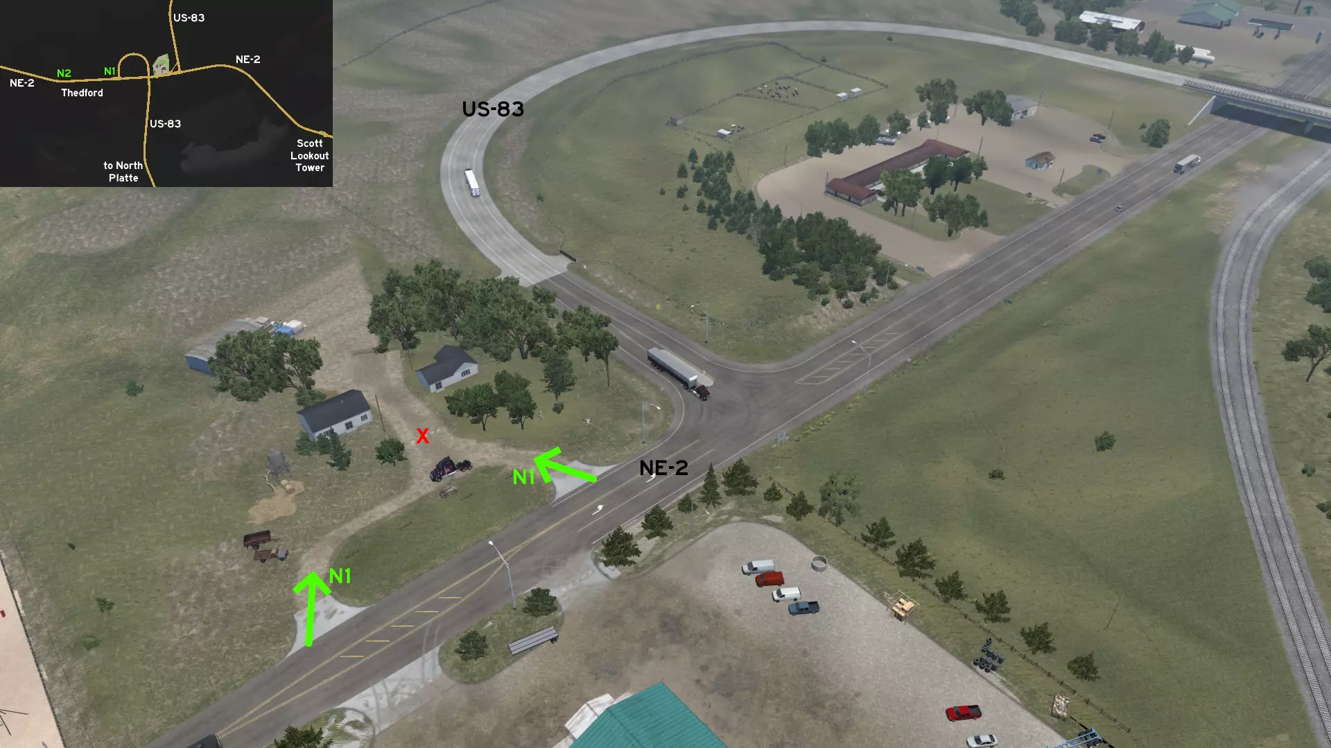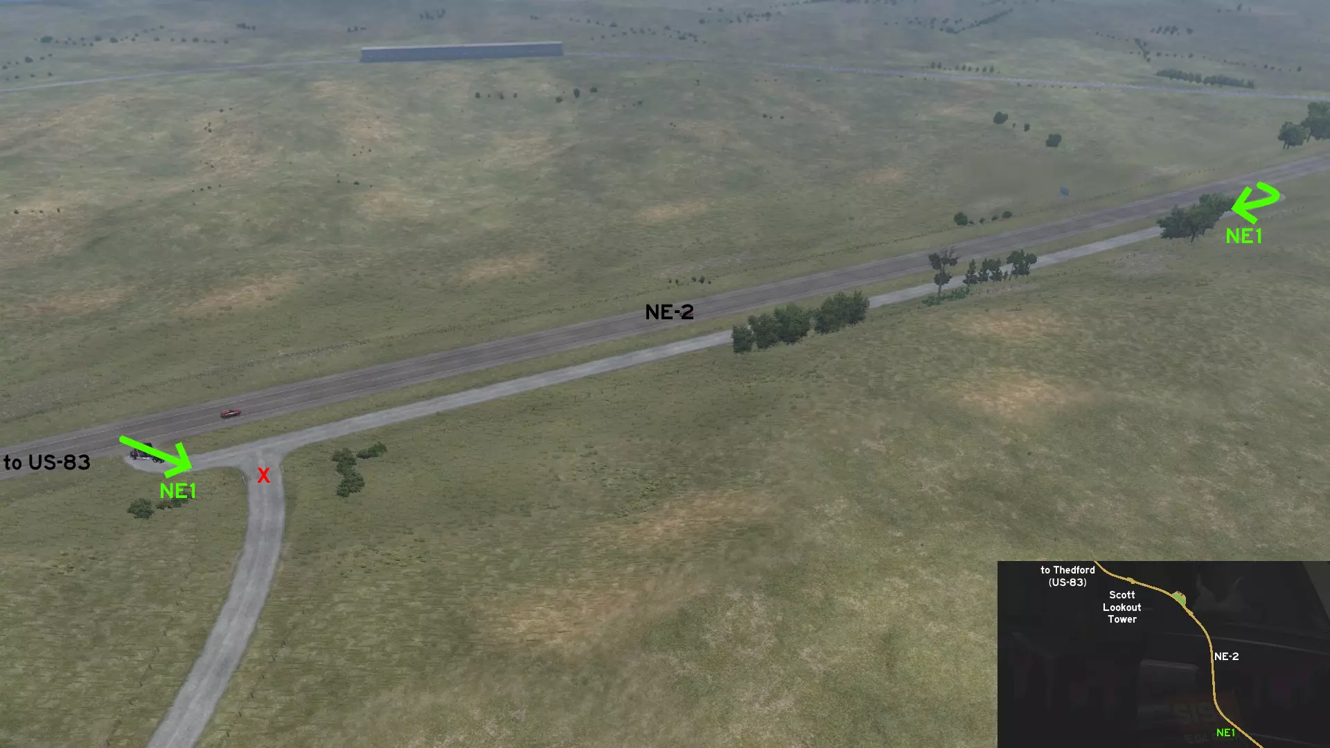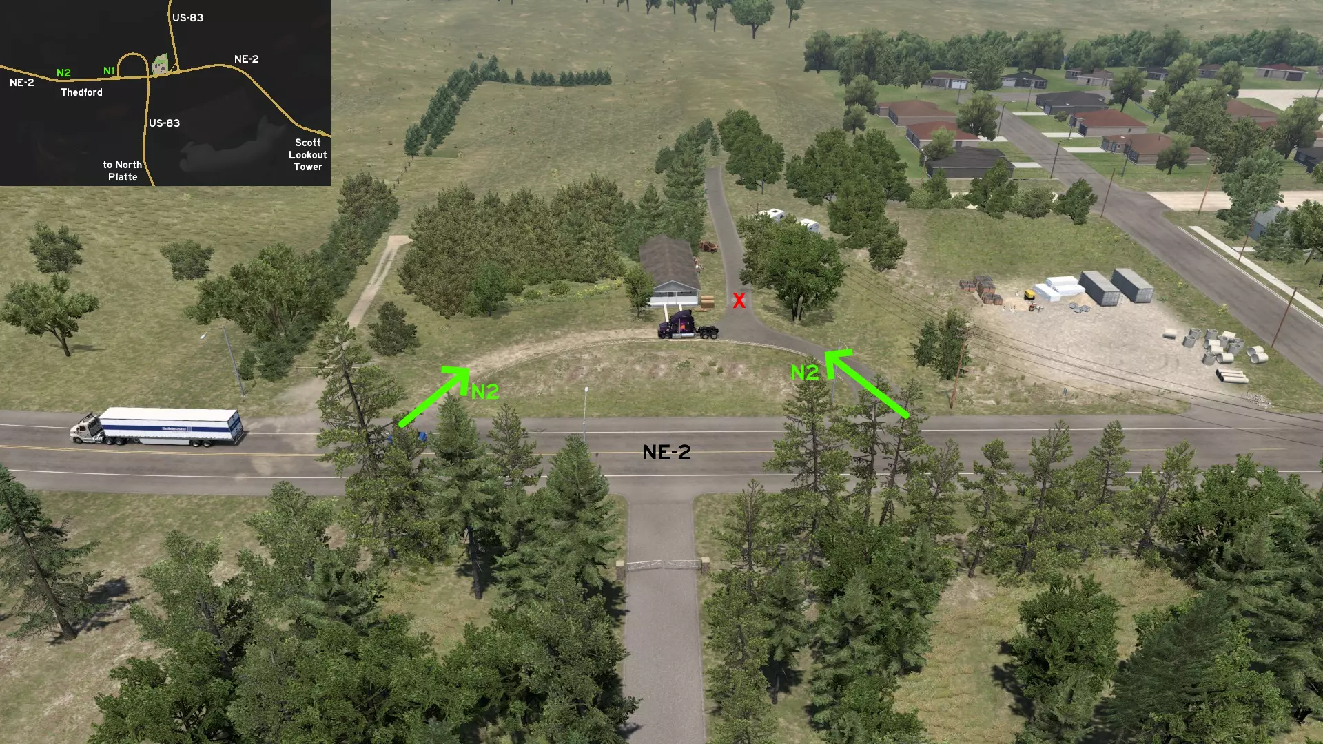 在北普拉特东北部,更准确地说是在未标记的塞福德镇东南部,NE-2公路与US-83公路的交汇处,以及斯科特瞭望塔的导演剪辑版(Director's Cut)和一个小型卡车停靠站附近,有一条沿着NE-2公路延伸的长长的 gravel path(碎石路)。