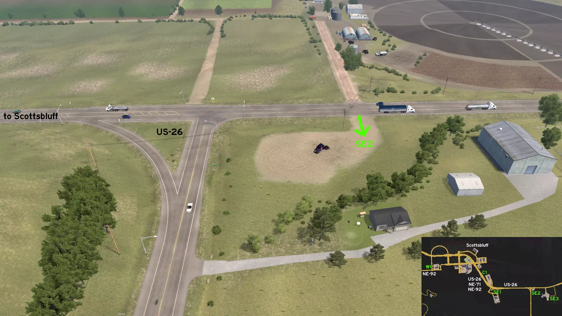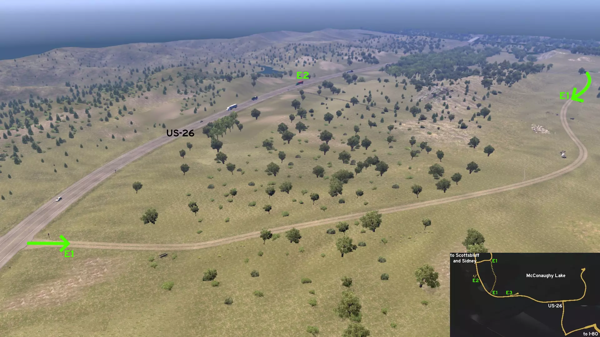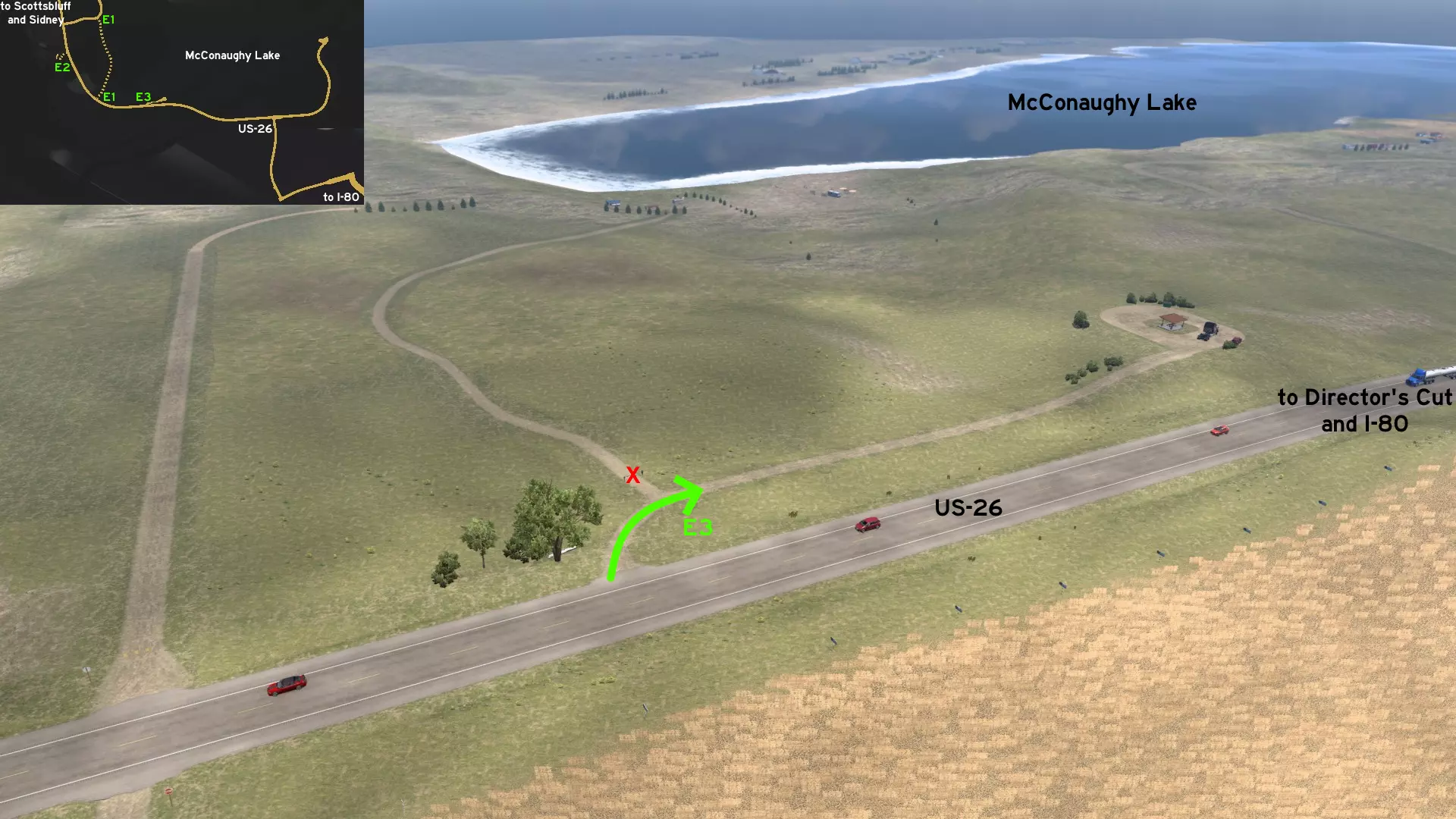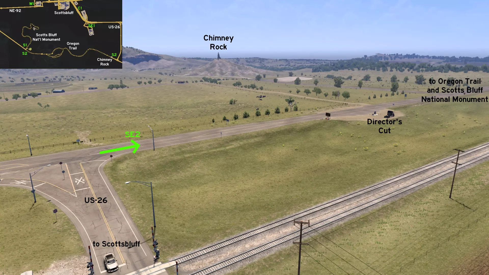 在北普拉特东北部,更准确地说是在未标记的塞福德镇东南部,NE-2公路与US-83公路的交汇处,以及斯科特瞭望塔的导演剪辑版(Director's Cut)和一个小型卡车停靠站附近,有一条沿着NE-2公路延伸的长长的 gravel path(碎石路)。