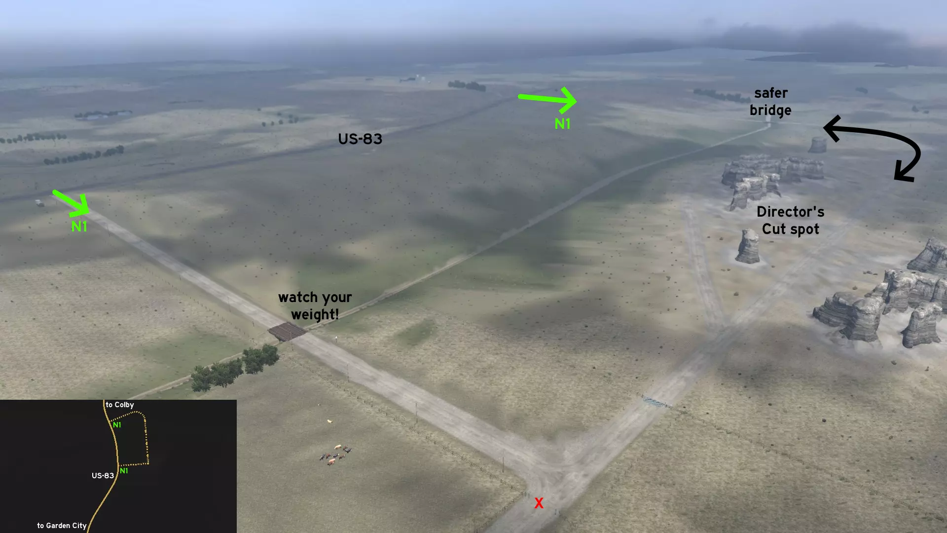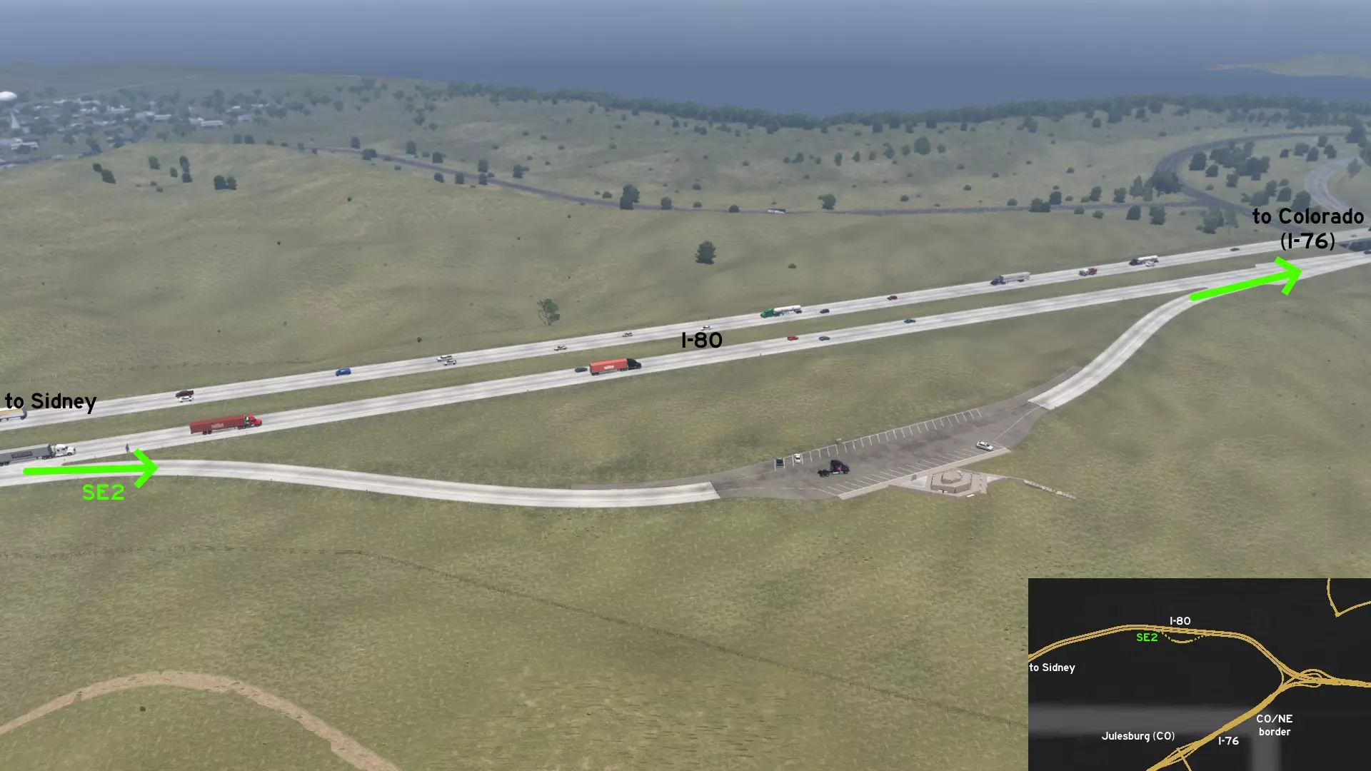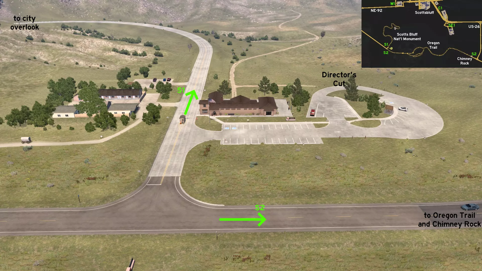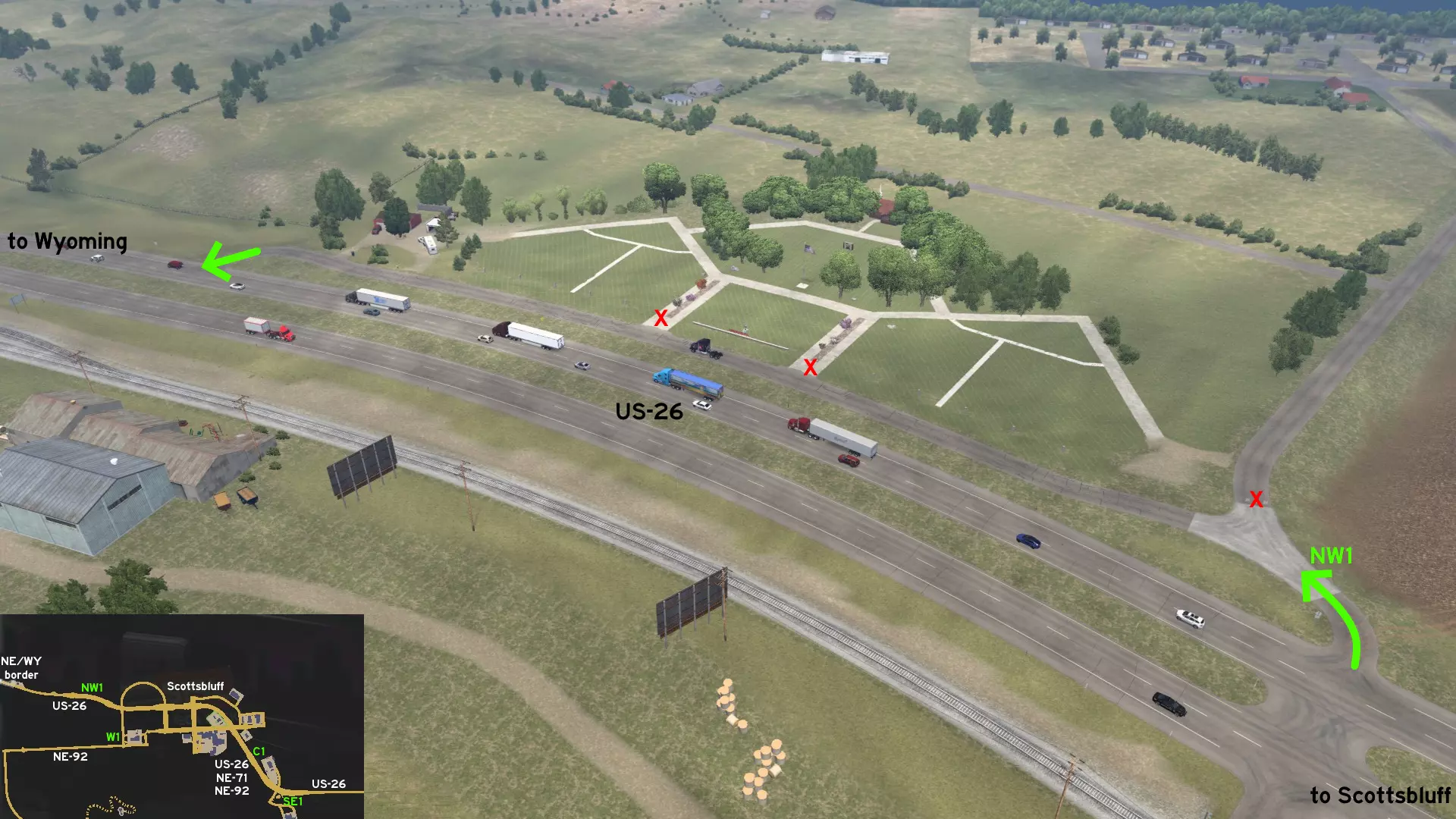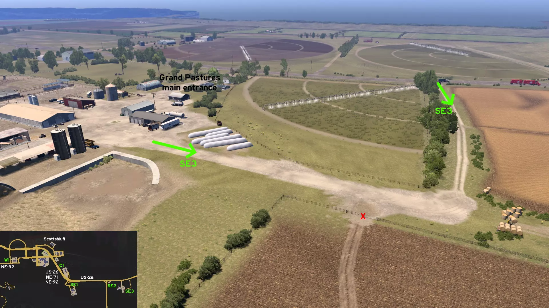 在北普拉特东北部,更准确地说是在未标记的塞福德镇东南部,NE-2公路与US-83公路的交汇处,以及斯科特瞭望塔的导演剪辑版(Director's Cut)和一个小型卡车停靠站附近,有一条沿着NE-2公路延伸的长长的 gravel path(碎石路)。