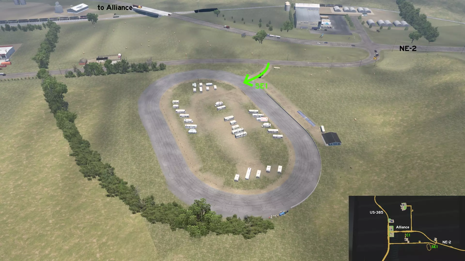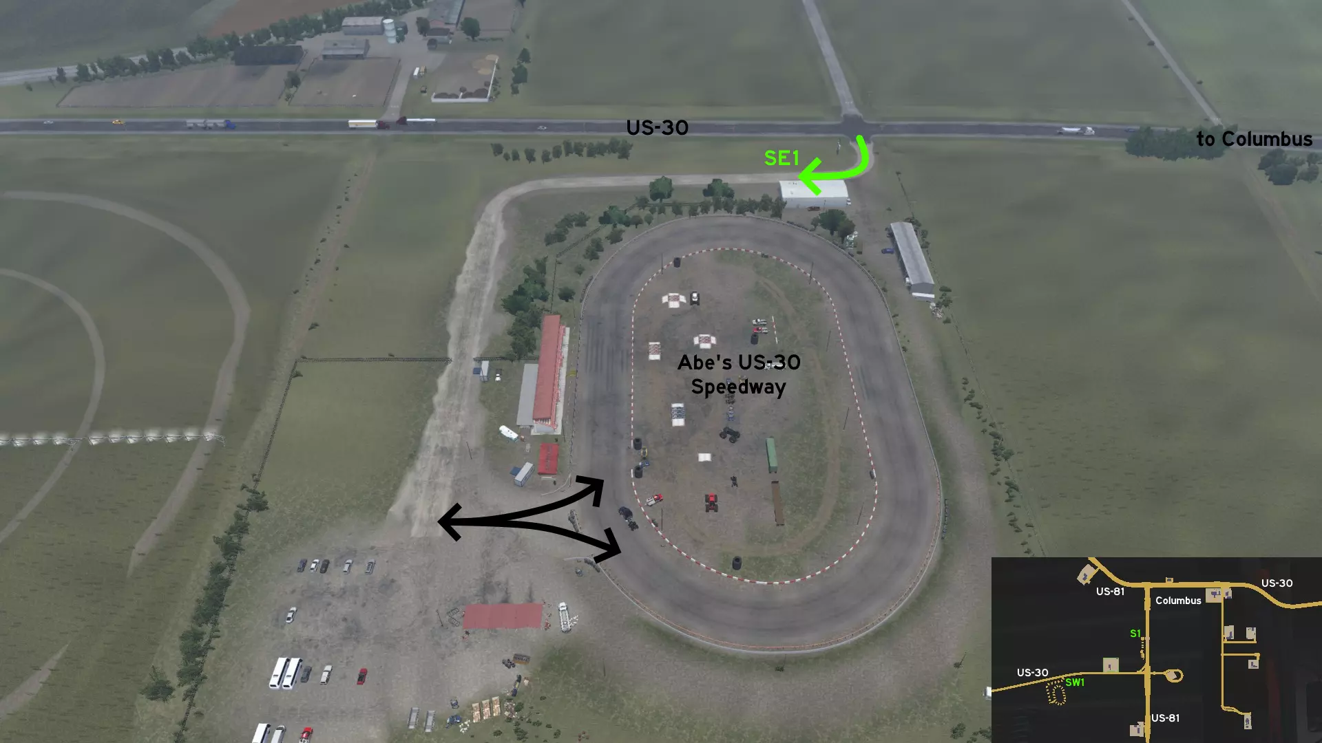 在哥伦布市外的休息站以西,沿第一条向南的道路可前往亚伯的US-30赛道。这条小路环绕赛道西侧,终点分别连接停车场和赛道本身。赛道内还能找到多辆赛车、怪物卡车及拖车。 格兰德岛 北部1 - 平行线 类别:捷径,可标记 发现物:OWLCAT