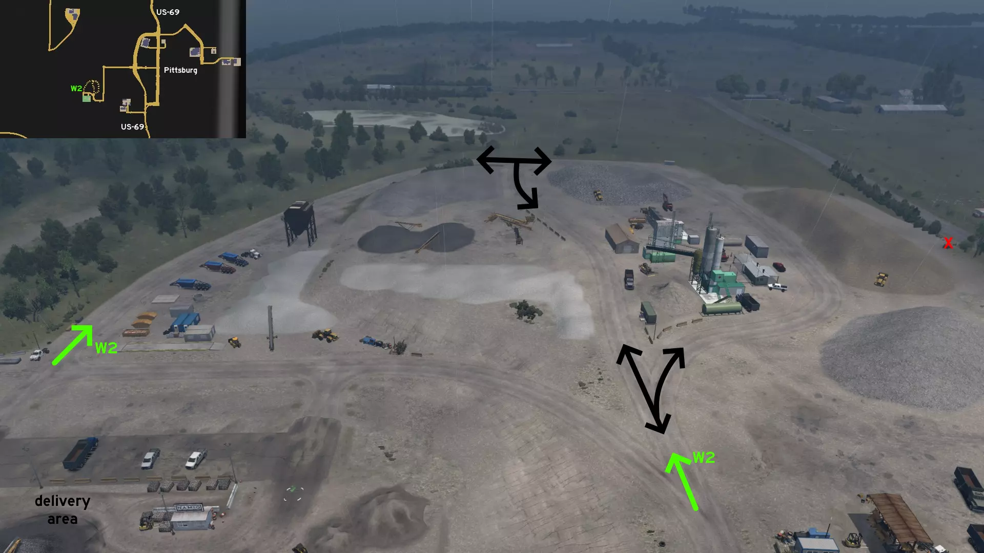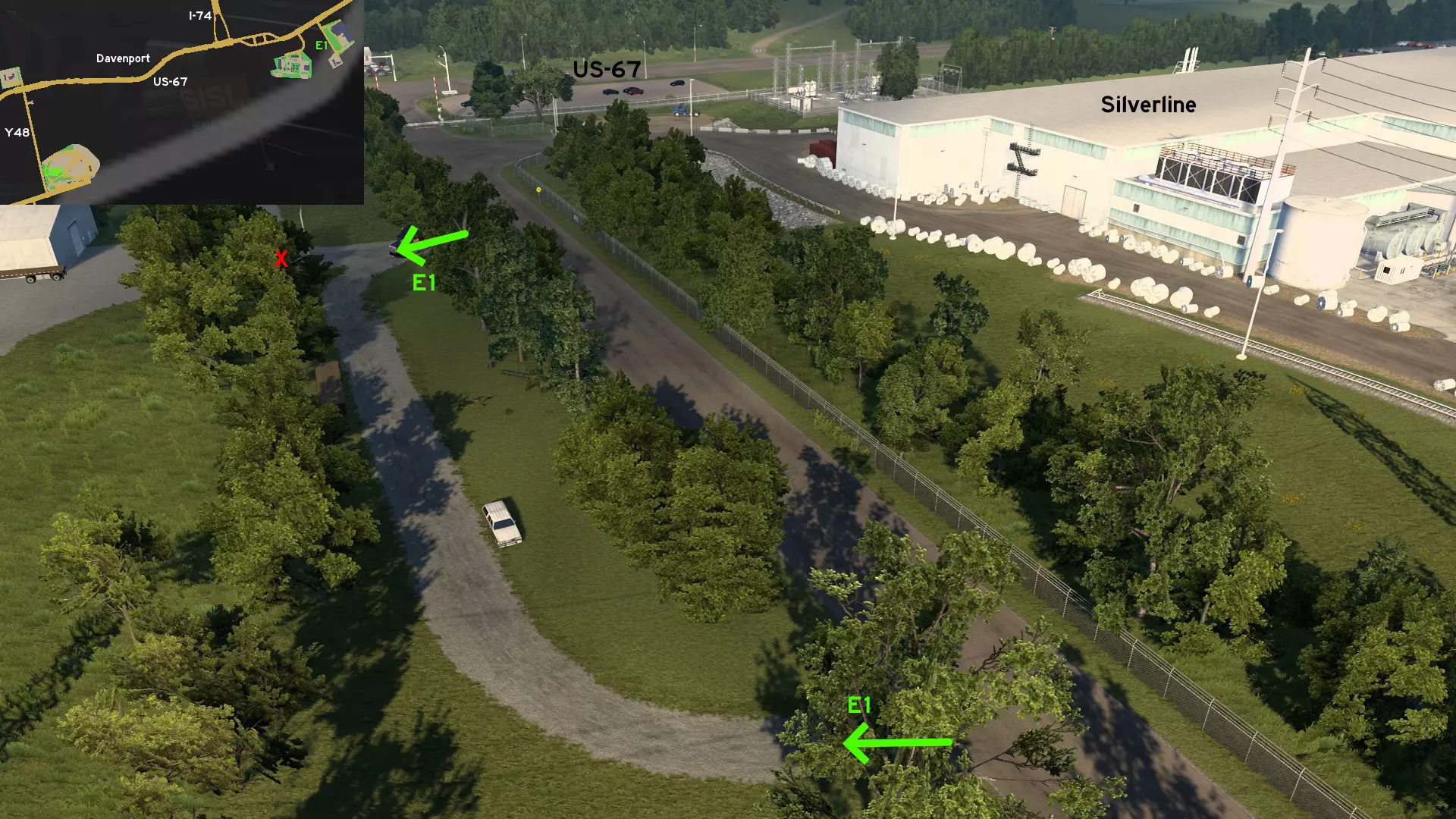 从达文波特出发,前往US-67公路,然后前往通往银线(Silverline)和漩涡(Vortex)的道路。在银线车站正前方,有一个碎石环路可用于车辆调度。