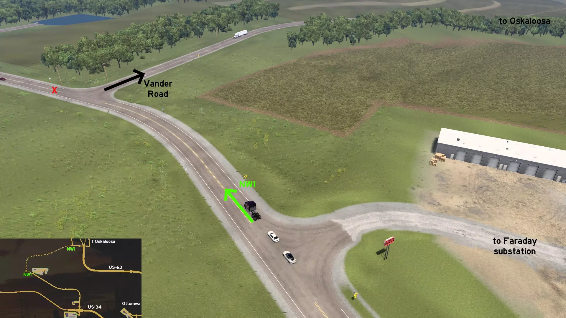 前往奥塔姆瓦西北部的法拉第变电站。从变电站入口一直向前走,然后右转(向北)进入范德路。这条路的尽头是美国63号公路的交叉路口,距离未标记的奥斯卡卢萨镇观景点还有几英里。