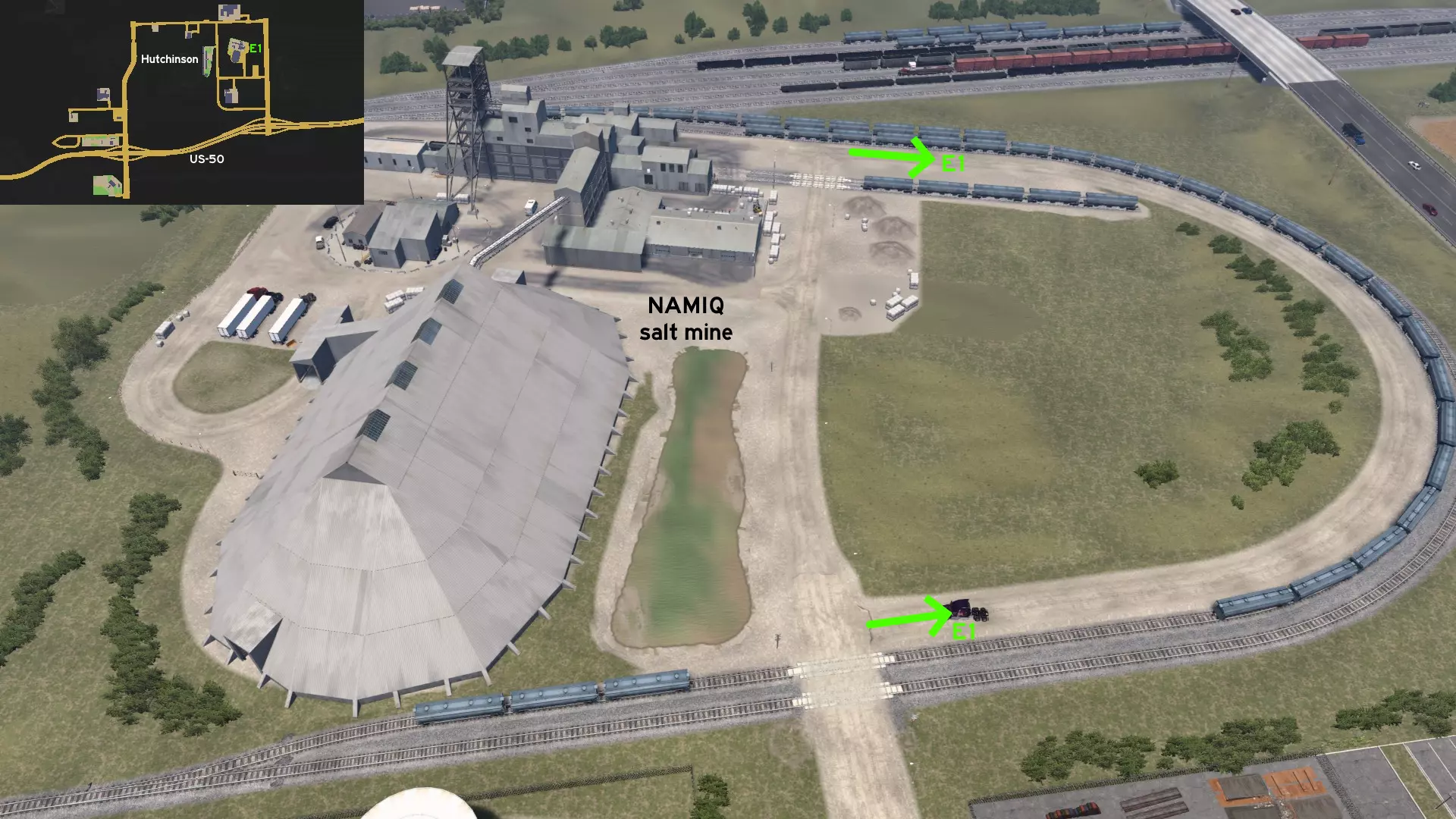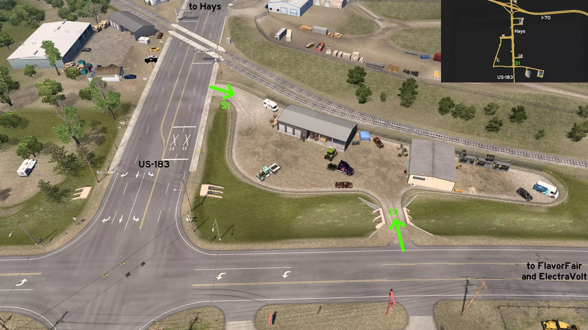 向南前往海斯。在铁路道口与美国183号公路和通往FlavorFair及ElectraVolt的道路交叉口之间,有一个停车场可作为绕行路线,但不可在此休息。 哈钦森 东部1 - 火车环路 类别:风景 发现物:Zest