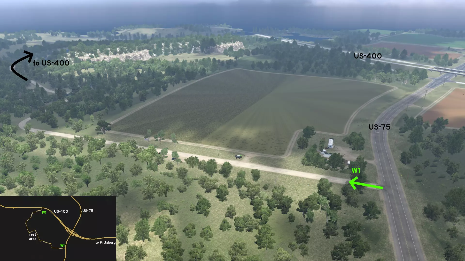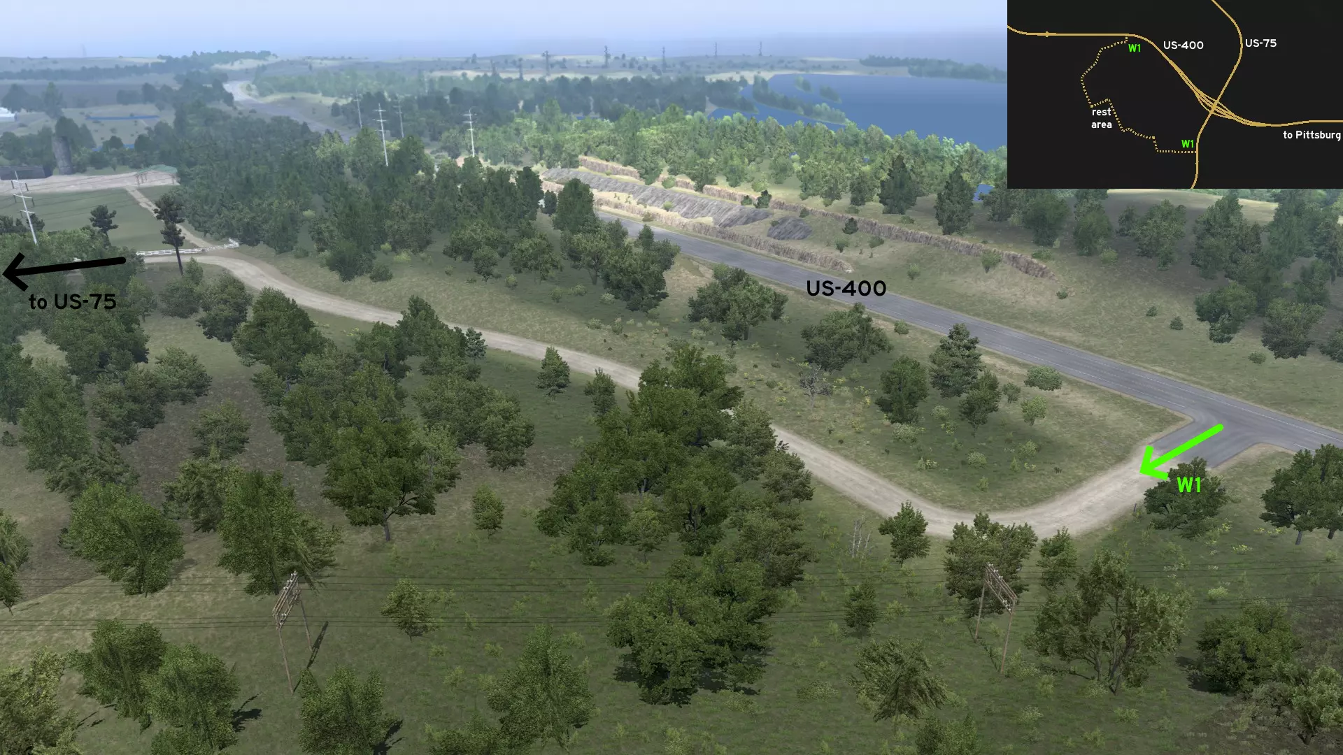 在匹兹堡以西,有一条长长的农场道路连接着US-75和US-400公路。北入口位于US-400公路上,在交叉路口之后几英里处,且在前往威奇托途中的休息区之前。