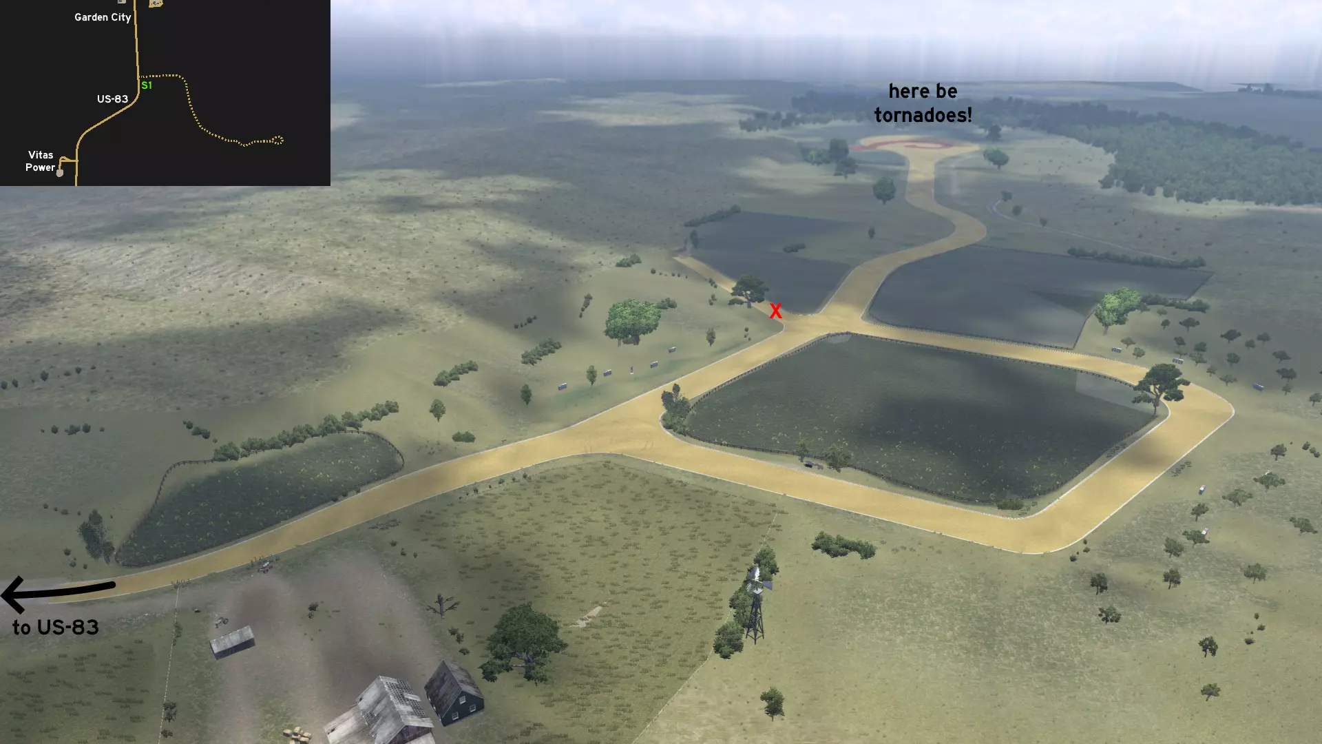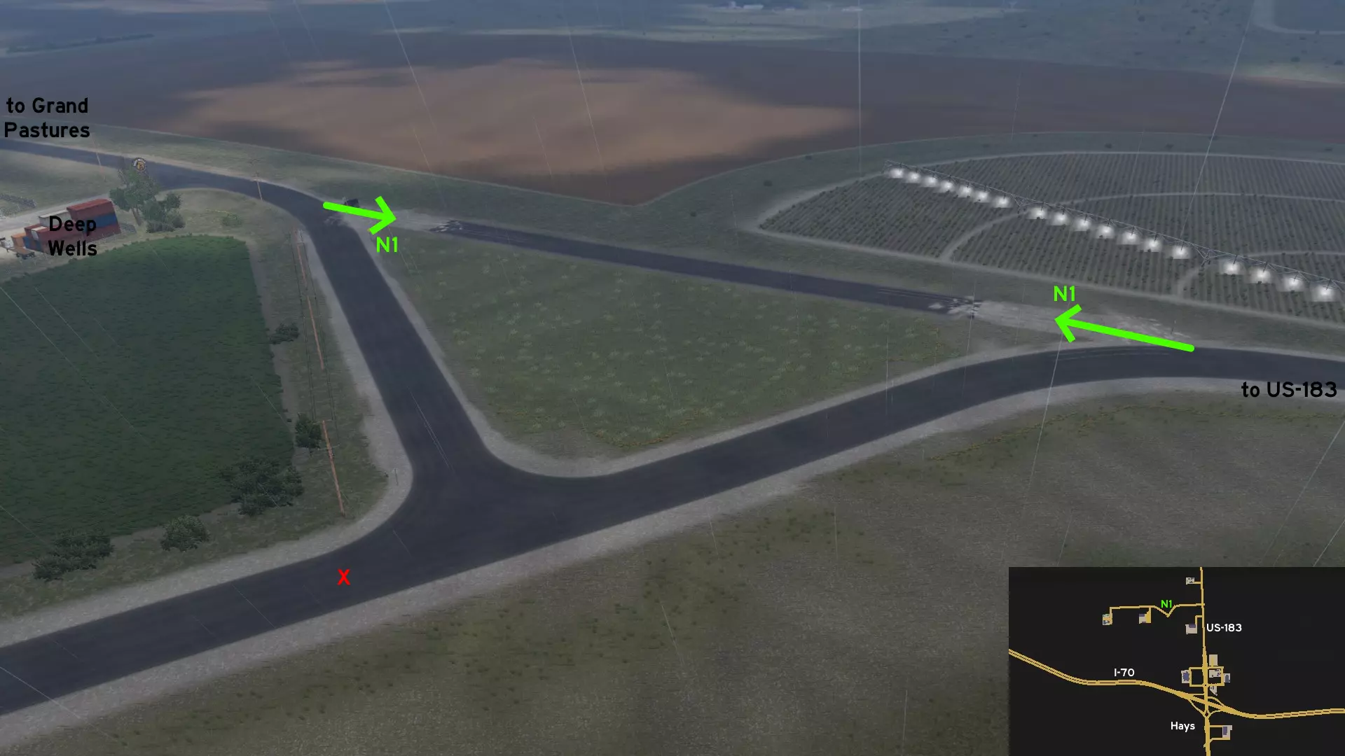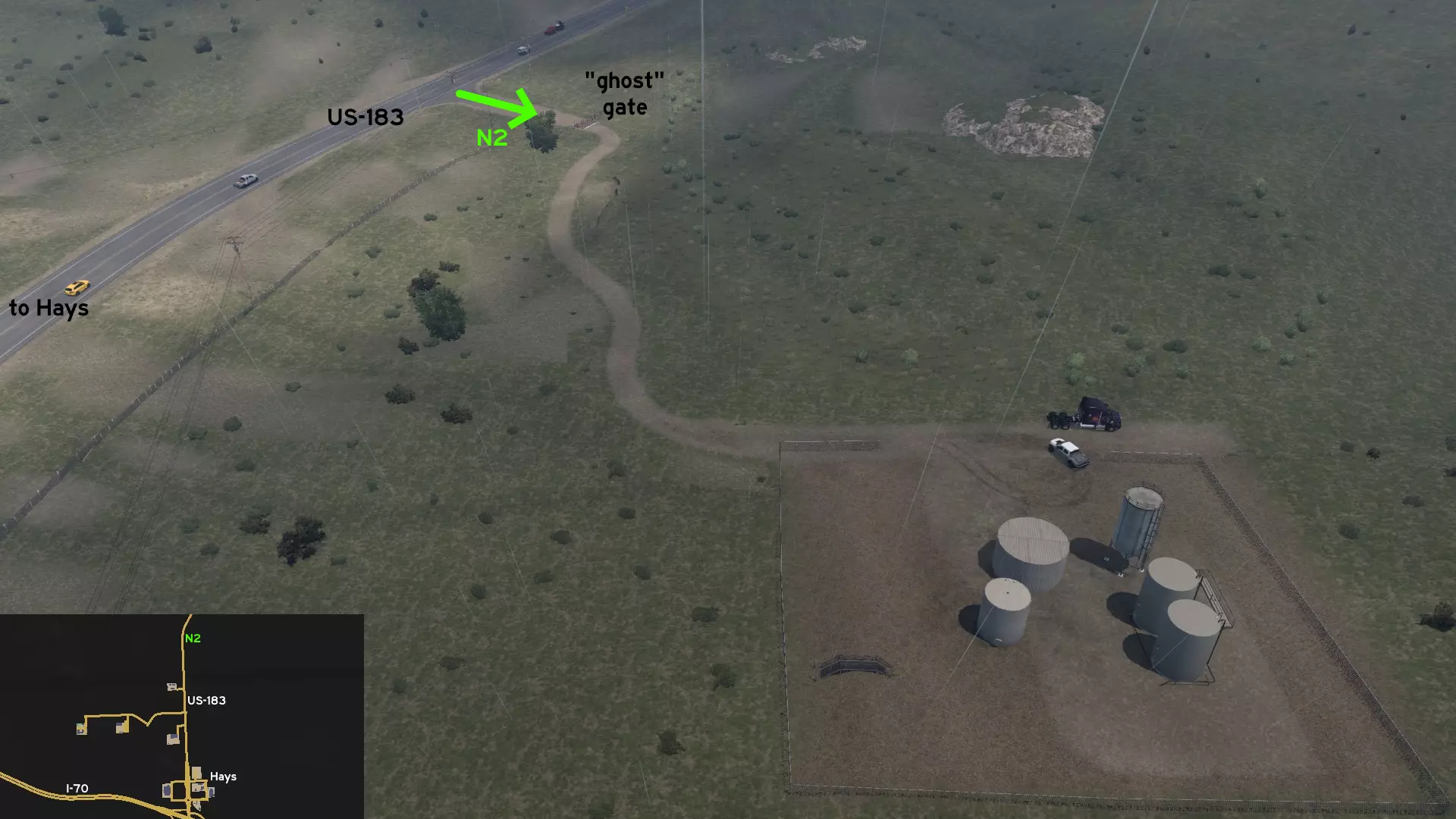 从海斯北部经由US-183公路离开。前往Petrolucent油泵站后的弯道处。那里有一条通往私人领地的土路,设有一个可供车辆驶过的大门。继续向东行驶,直至抵达筒仓。你可以继续往前开,但请注意,你可能会坠入虚空!
