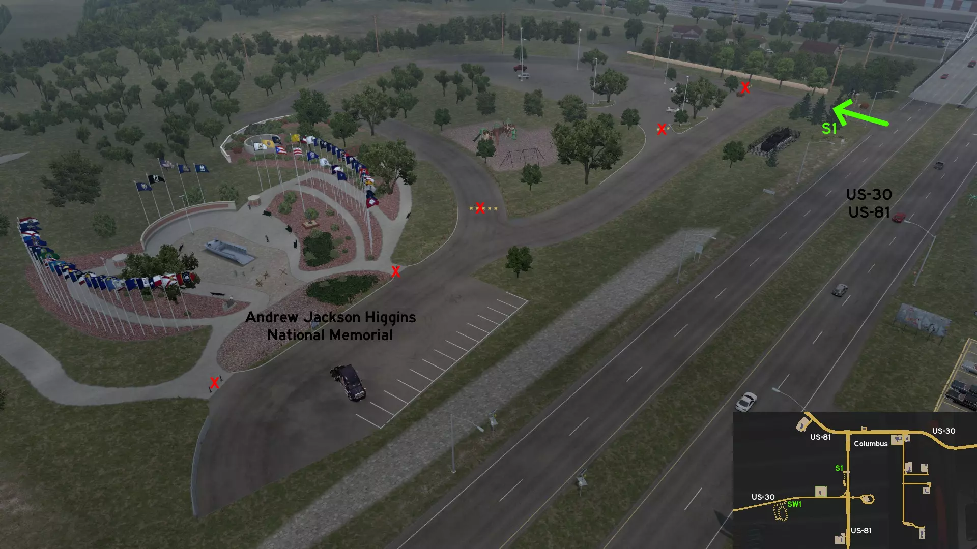 穿过伊阔斯动力仓库,往前走几米就能找到一条小土路。你会看到一条环形道路,里面有一个拖车公园,旁边立着一块关于联盟陆军机场的历史标牌。 哥伦布 南部 1 - 安德鲁·杰克逊·希金斯国家纪念碑 类别:风景,可标记 发现物:碧玉,苹果玉米