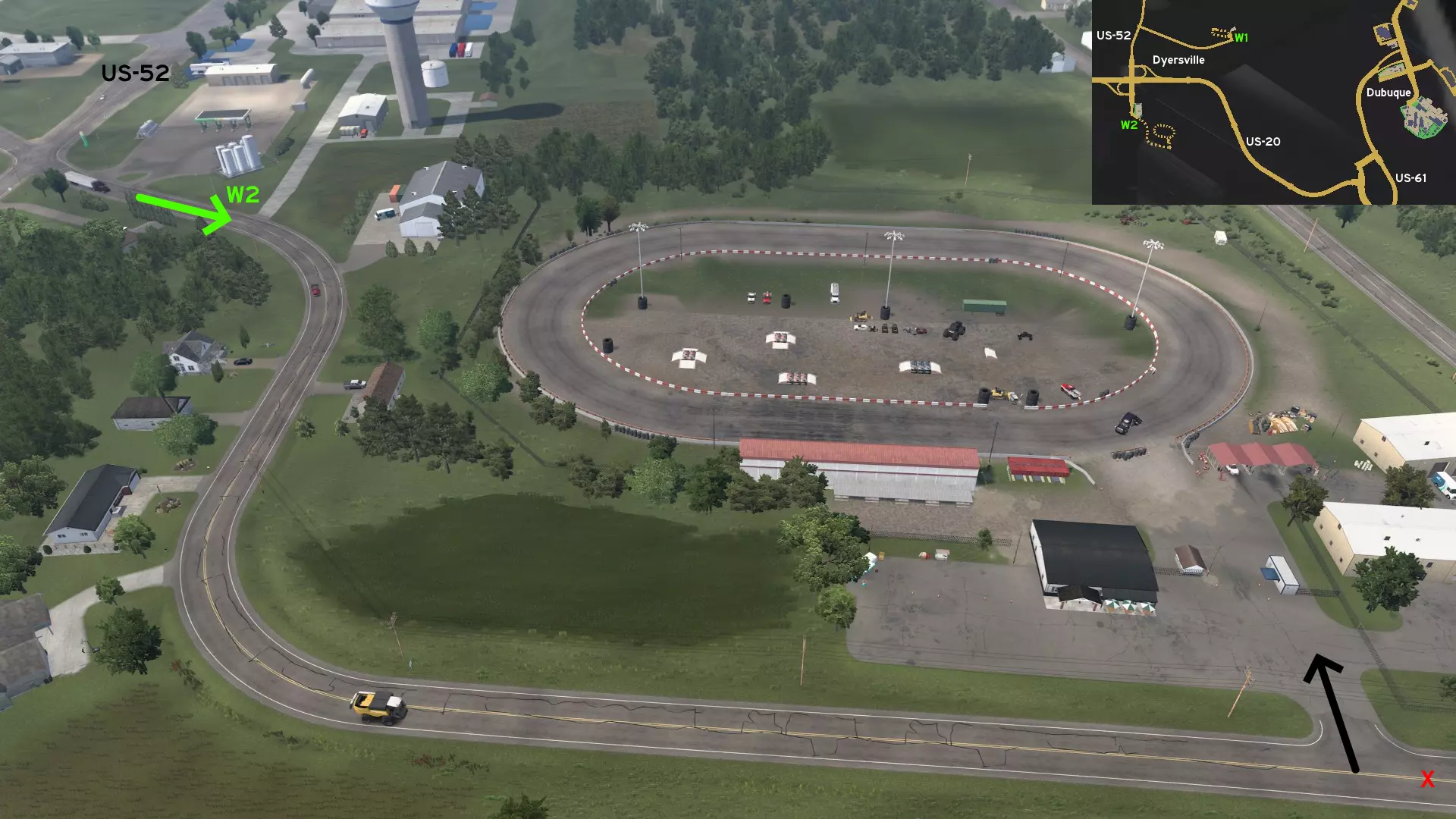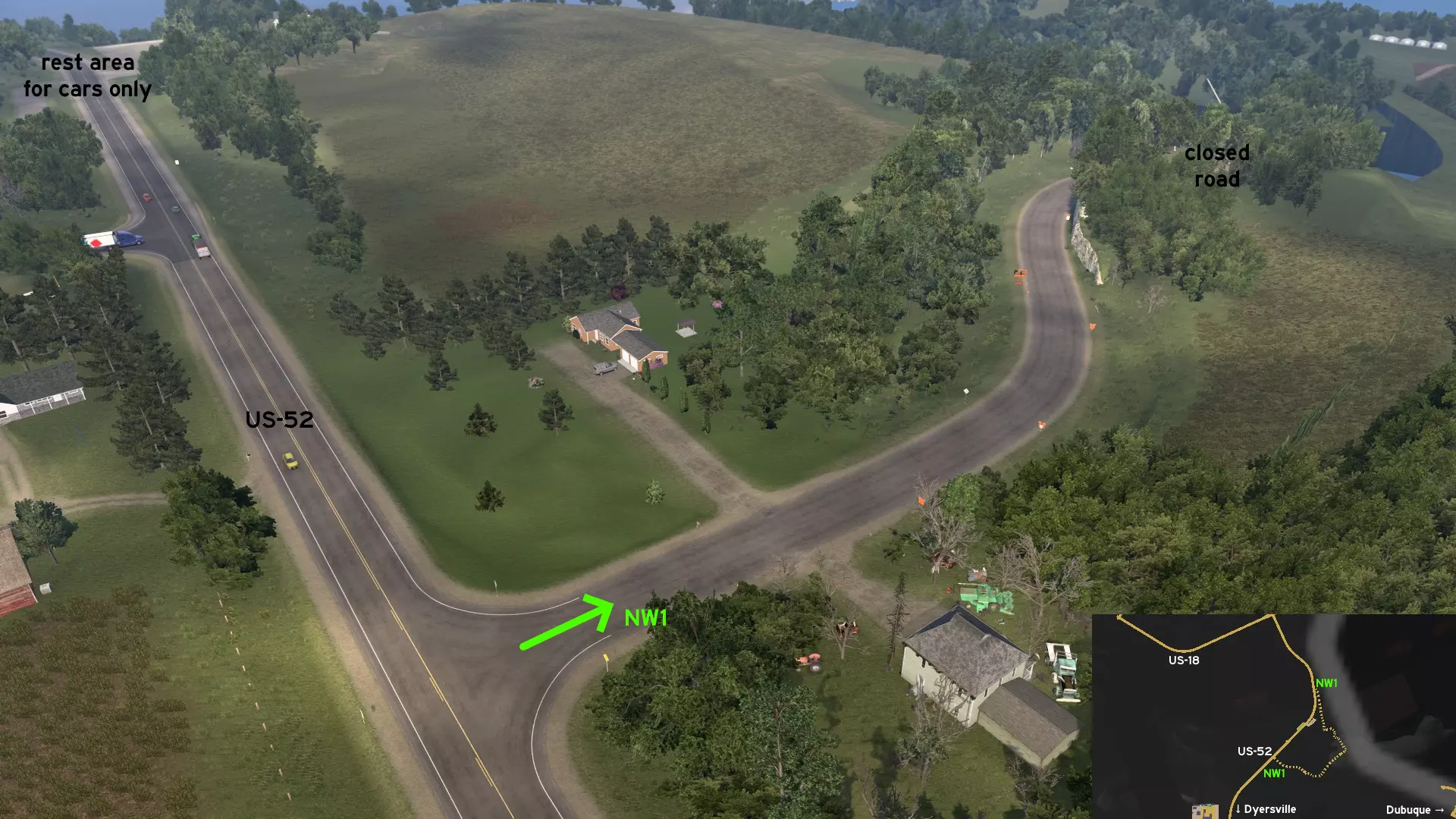 从西迪比克出发,沿US-20公路行驶,然后从US-52公路南出口前往未标记的代尔斯维尔镇。从加油站向东南方向继续行驶。在到达最后一个弯道前,左转(向北)。现在你可以在300赛道上比赛了。 道奇堡 西北1号 - 不同业务,相同道路 类别:捷径,可标记 发现物:olm823249
