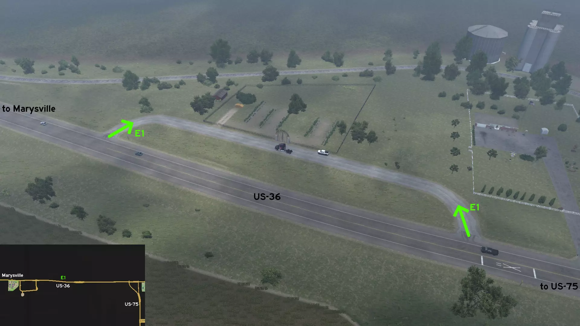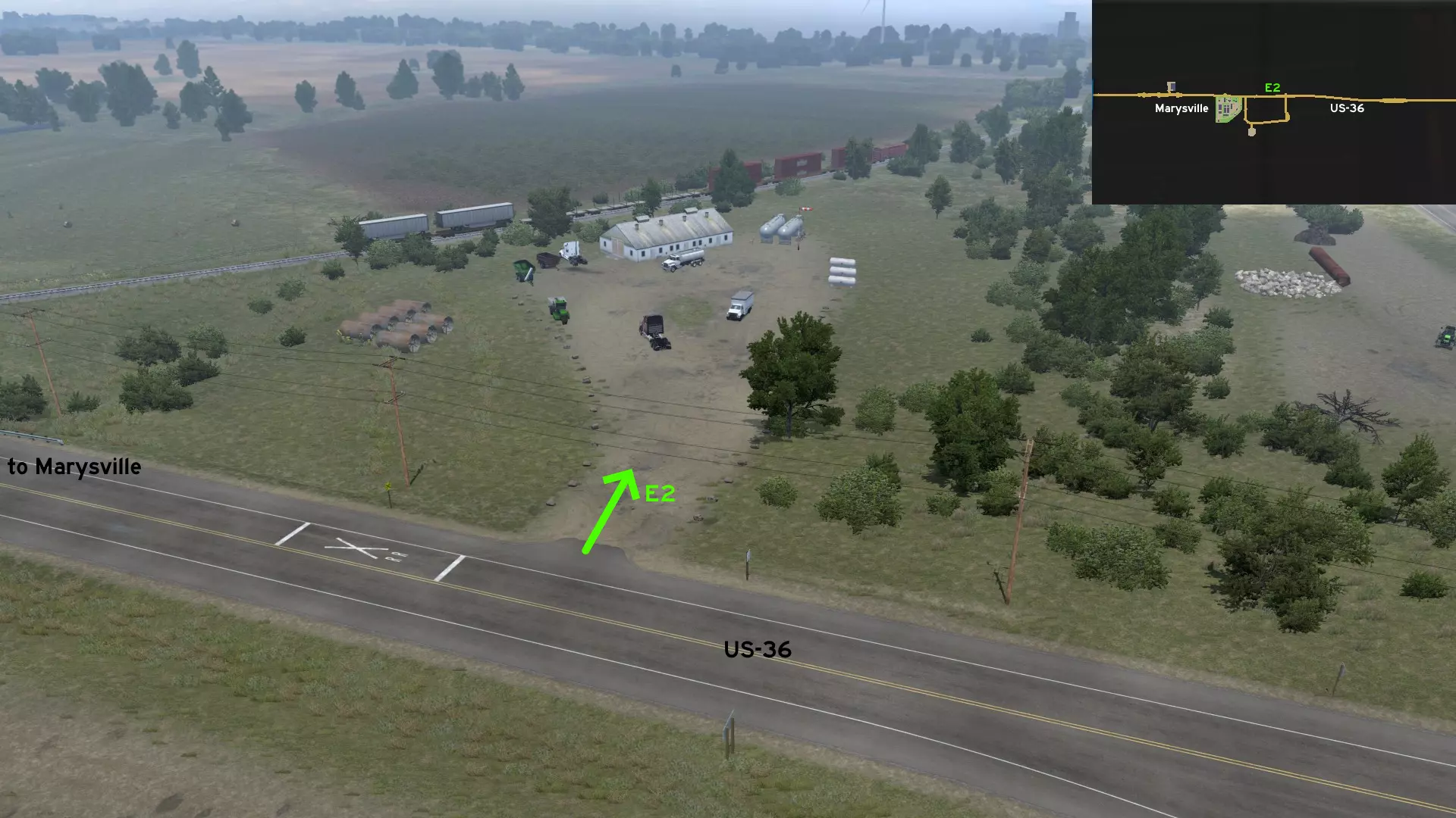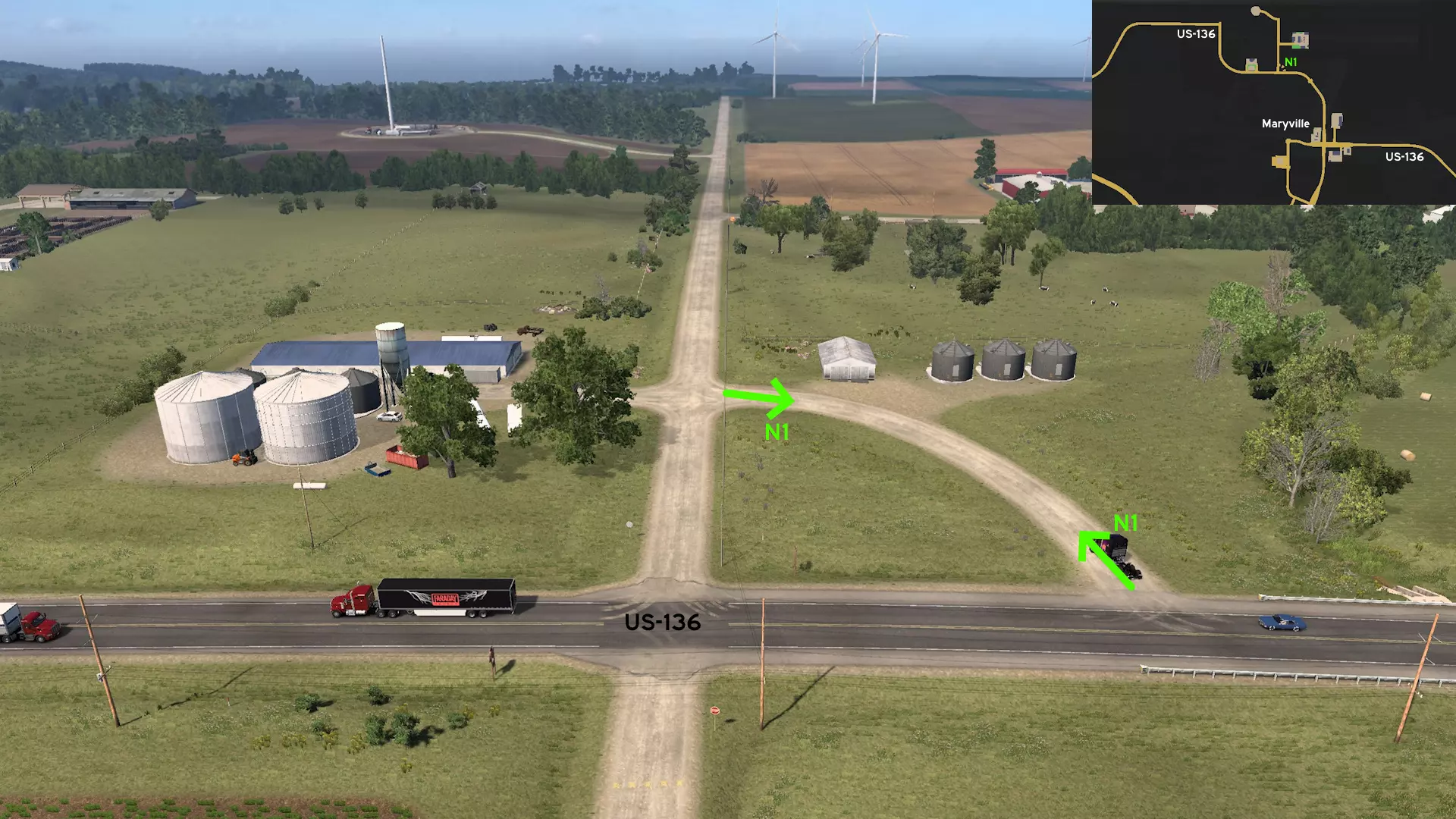 从南柯克斯维尔出发,沿63号美国国道向东行驶,之后转入36号美国国道。从61号美国国道离开,前往南部的加油站。不过不要进入加油站,而是继续沿普莱森特街向东行驶。你可以驾车绕过密西西比河沿岸那个没有标记的汉尼拔小镇,然后在可以看到一家披萨屋和德克炸鸡店的路口返回61号美国国道。 玛丽维尔 北部1号 - 农场与风电场环路 类别:捷径,可标记 发现物:苹果玉米