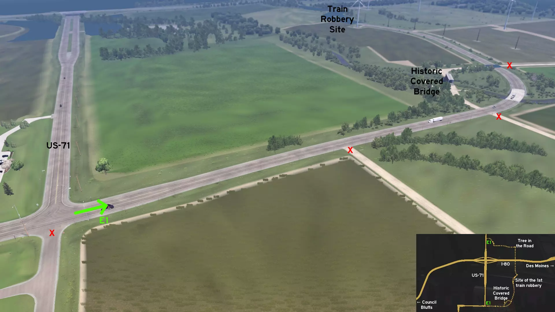 从康瑟尔布拉夫斯东部出发,沿80号州际公路行驶,在前往得梅因的中途驶离,进入71号美国国道。向南行驶,然后再次向东。你可以穿过一座麦迪逊县廊桥。继续向北行驶,你会看到杰西·詹姆斯团伙实施第一次火车抢劫的地点。驶过80号州际公路后,你会看到“路中树”,之后返回71号美国国道,在到达奥杜邦镇和“世界最大公牛”雕像前几英里处。