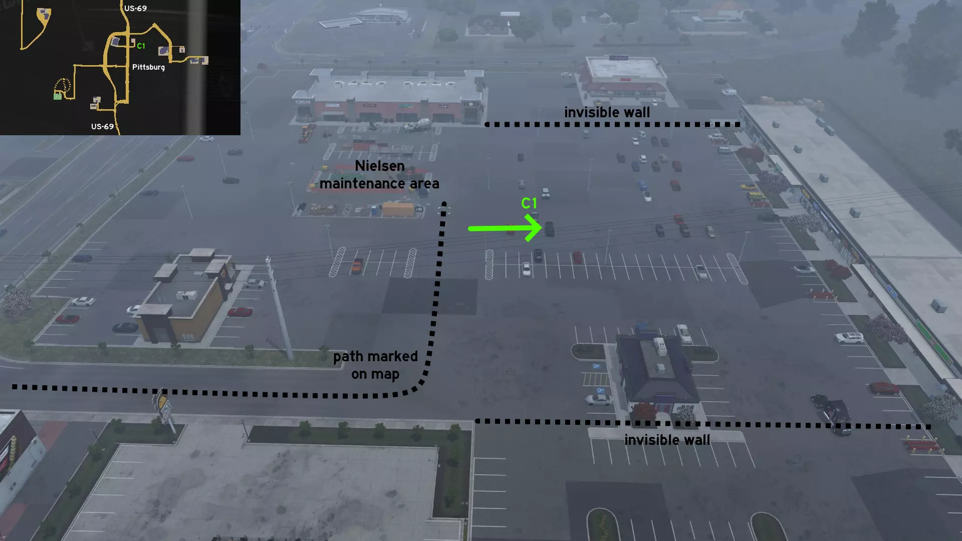 前往乔普林西北方向,以及皮茨堡(堪萨斯州)的南部。隐藏道路分布在两个州:密苏里州的历史悠久的66号美国国道,终点位于一家横跨两州的改装车酒吧的州界公路,以及堪萨斯州未标记城镇加莱纳的主街——在那里你会发现一些看起来很眼熟的卡车。 堪萨斯城 另见堪萨斯州的堪萨斯城 东部1号 - 从服务站到变电站 类别:捷径,可标记 发现者:Oni 更新者:Cyanlix 注意:尘土飞扬的小路不可标记