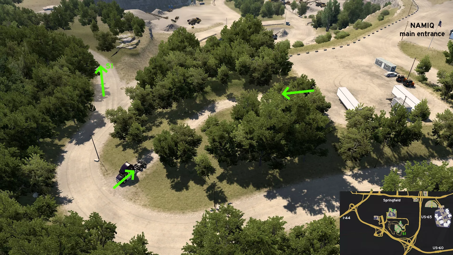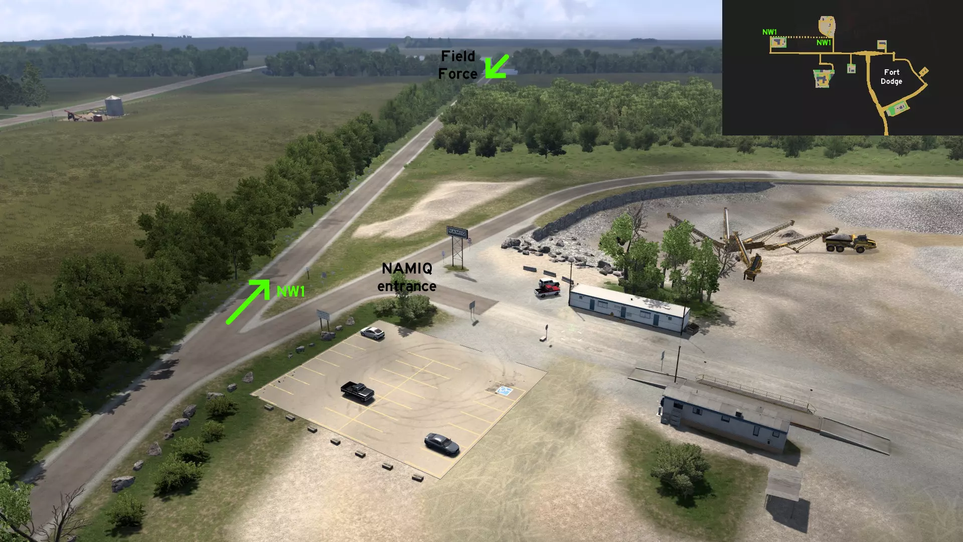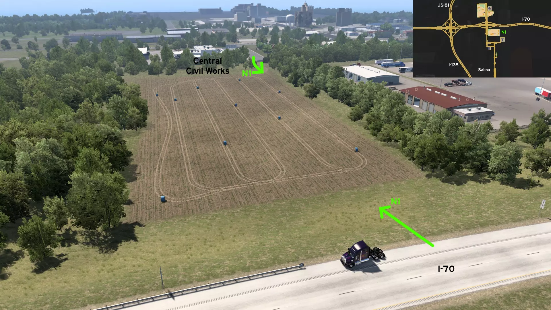 在纳米克(Namiq)北部,有一条尘土飞扬的巨大环形道路。当拖挂长 trailer(拖车)往返于交货区域时,可使用该道路以便于操作,但它不能作为通往主路的捷径。你可以找到一些员工休息区,以及一些废弃车辆。 萨利纳 北部 1 - 从土木工程处穿过田野 类别:捷径 发现者:FelipeVinhao