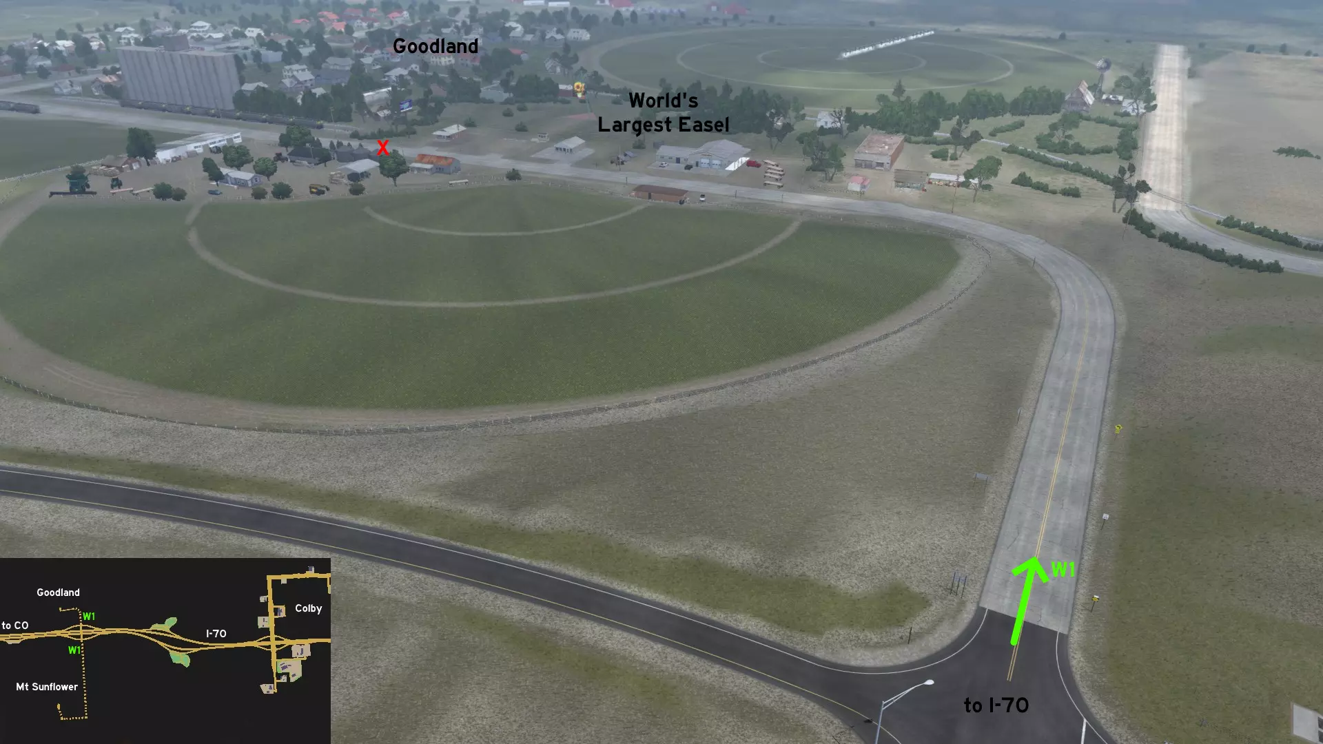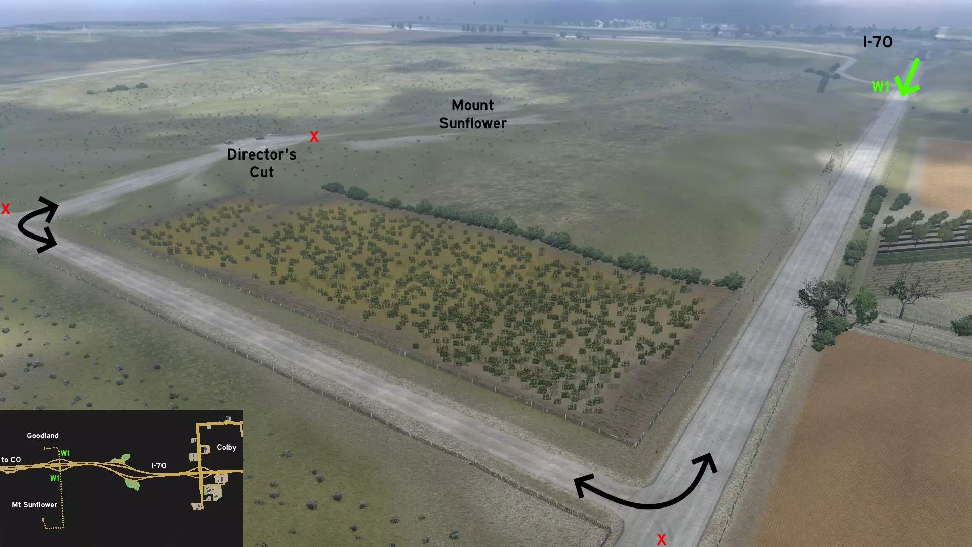 南入口位于US-75公路上的铁路道口前几米处。这条路线穿过一片广阔的向日葵种植园,在另一个铁路道口附近设有休息区,但该道口没有声音或灯光警示,因此请小心驾驶。