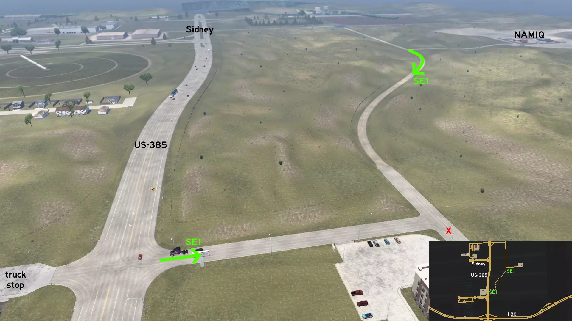 从西德尼的NAMIQ矿场出发,向南行驶,即可直接返回US-385公路,前往I-80公路附近的卡车停靠站,从而避开主干道的交通拥堵。