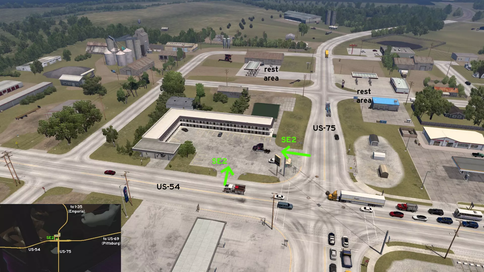 在美国54号公路与75号公路交叉路口的西北角,恩波里亚和匹兹堡之间,有一家汽车旅馆可供你停车,但无法在此休息。不过好在附近还有另外两个休息区。