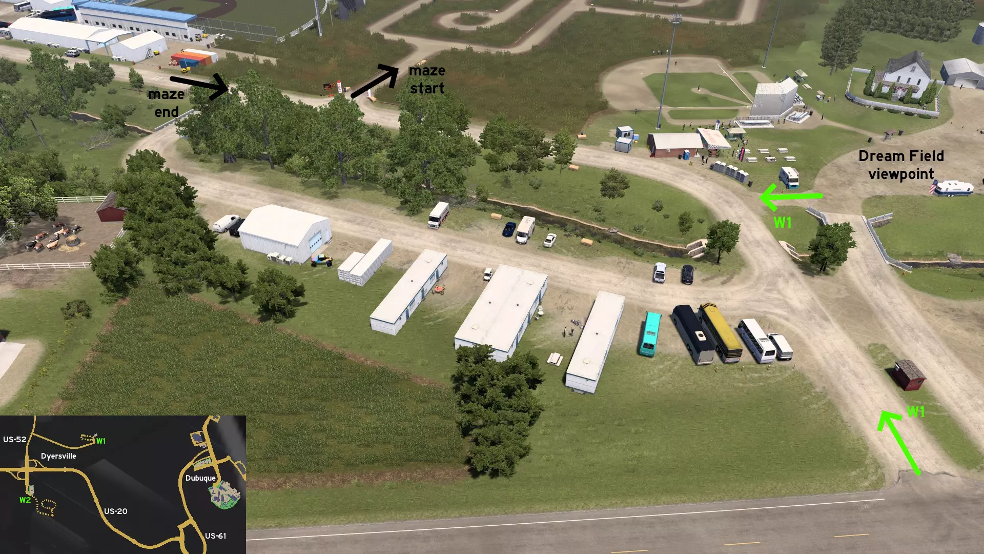 从西迪比克出发,沿US-20公路行驶,然后从US-52公路出口前往未标记的戴尔斯维尔镇。向东行驶至《梦幻之地》的拍摄地。在观景点西侧,有一条环路通向玉米地迷宫的起点和终点。建议不要拖着拖车进入那里。