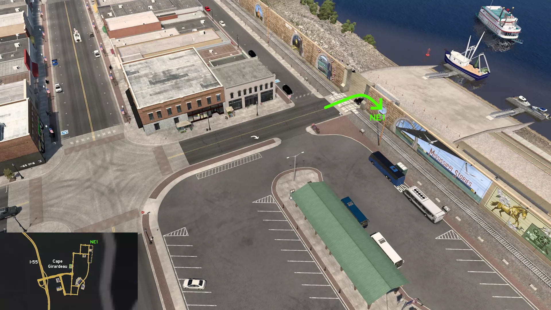 向东北方向前往开普吉拉多。当你到达尼尔森道路施工处时,会收到一条提示附近有一个观景点的消息,暗示其入口位置。穿过铁路线后右转,即可找到观景点,然后沿着密西西比河行驶。