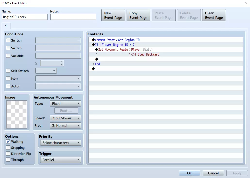 如果玩家站在标记为区域ID 7的地格上,条件分支判定为真,事件将执行其内容:在这种情况下,将玩家移回一格。 在此区域ID检查事件中,你可以添加任意数量的条件分支。这样,只需一个事件就能处理所有区域ID,以及玩家踏上带有区域ID的地格时会发生的情况。