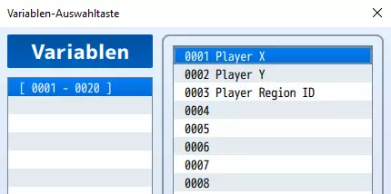 对第二个变量(玩家 Y)执行相同操作,将“玩家 -> 地图 X”替换为“玩家 -> 地图 Y”。 最后一行: 接下来,我们要在公共事件中添加最后一行。选择“获取位置信息...”,在随后打开的窗口中: - 变量:玩家区域 ID - 信息类型:区域 ID - 位置:使用变量指定 - X:玩家 X - Y:玩家 Y