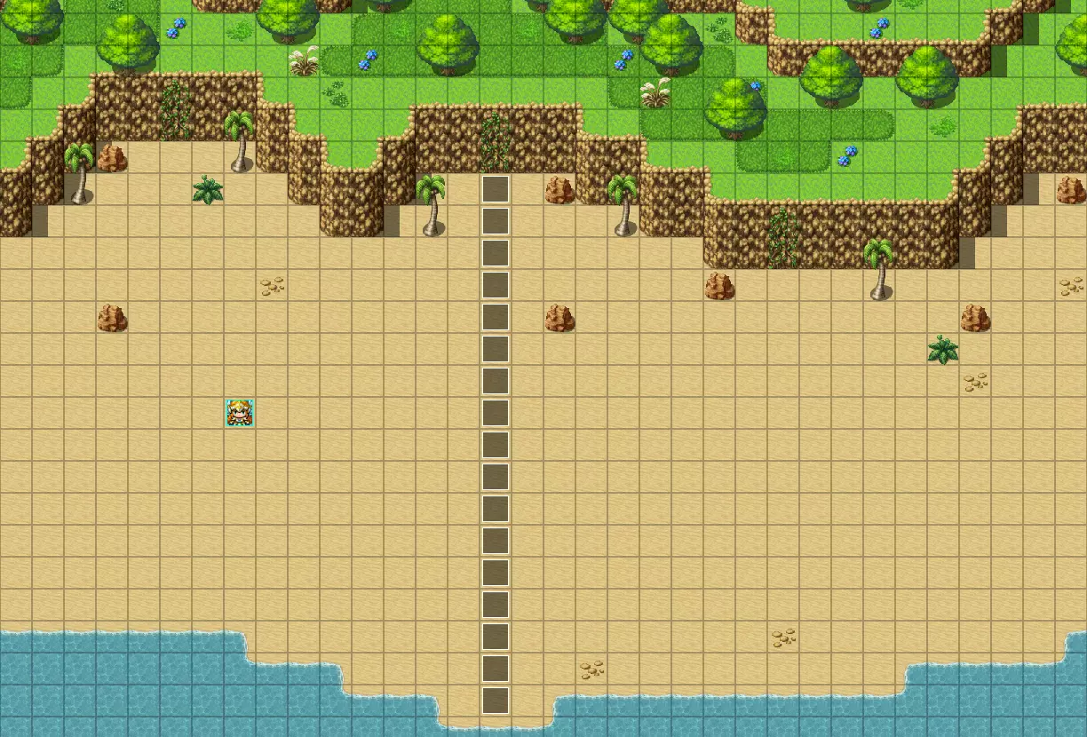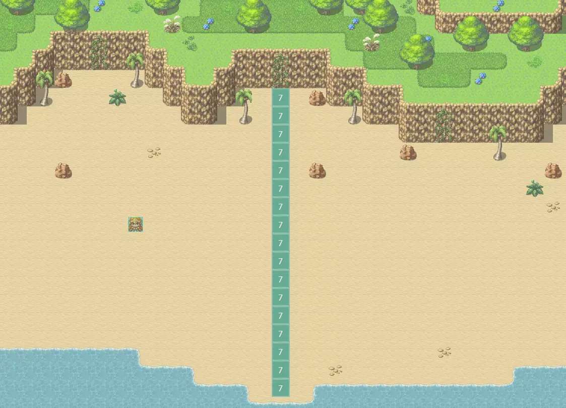假设你想阻止玩家到达地图的另一边(这里以海滩为例)。第一张图展示了许多RPG Maker新手(我以前也这样做过)倾向于使用的解决方法:设置无数个事件,当玩家触碰时就将其传送回去。如果在大型地图上使用这种方法,会变得非常混乱且毫无必要。一个更简单的方法是,只需用区域ID标记特定区域,然后添加一个事件,持续检查玩家当前所在的区域ID即可。