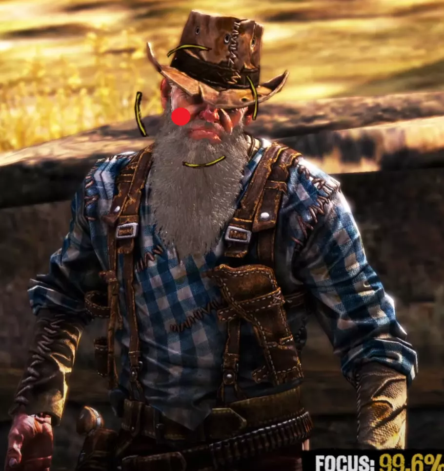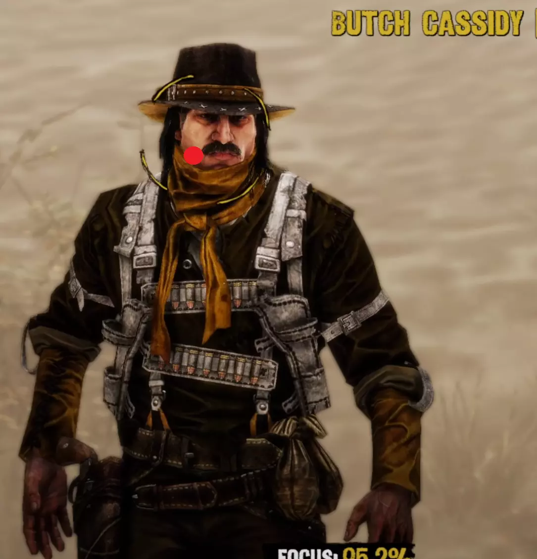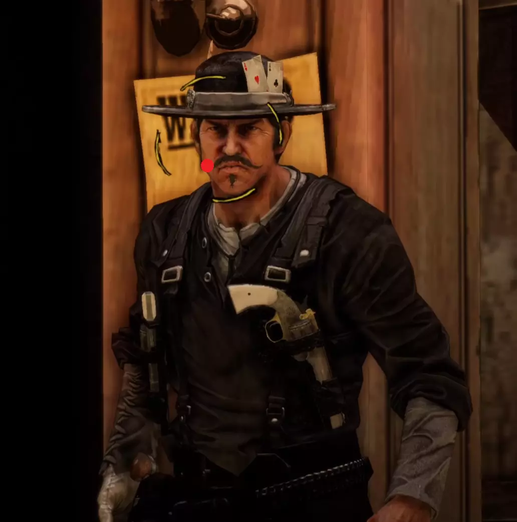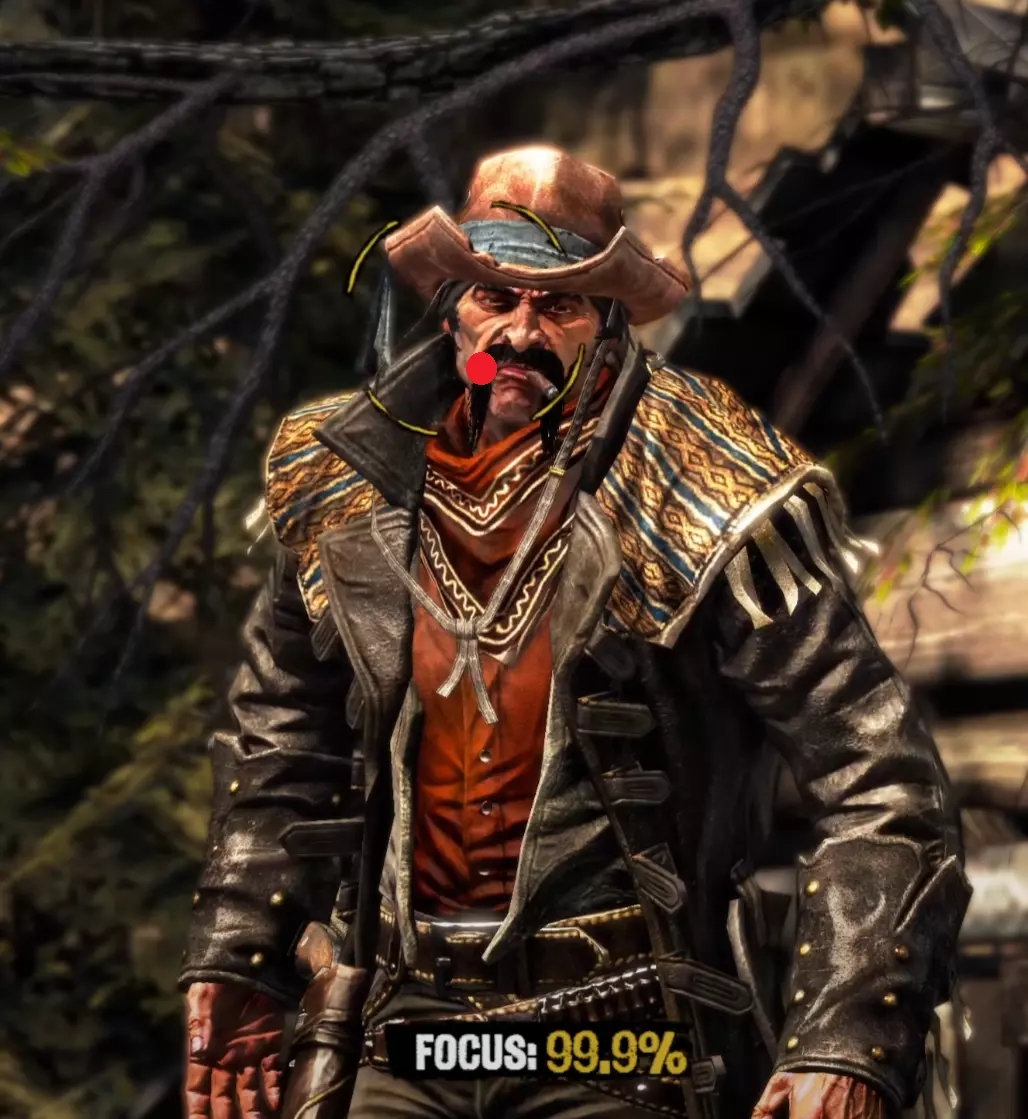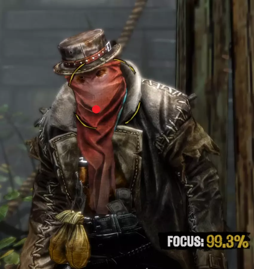 Aim Generally you want to keep your aim (center of the target circle) over the body of your opponent until he is done with his movement pattern, then move it up to his head. I find it is also generally better to be closer to the very left side of the cheek than closer to the middle of the head when you draw because of the way drawing moves your screen. It's annoying but doing this will often stop giving you focus right before you draw, so try to keep your target circle fully yellow yet as close to the left as possible. I am fairly certain that pre-draw target circle yellowness is a factor in whether you get a headshot or not. Having your target circle less yellow also makes the draw animation move much faster and thus makes it harder to manage. For Henry Plummer, the two Daltons, and the Sundance Kid and Butch Cassidy fight, use the body to get to 85%+ focus then move to the head. Most opponents only have one movement pattern, so you can definitely memorize the way each opponent walks and take advantage of that. Old man Clanton is an example of an enemy with two movement patterns. After enough practice, you'll be able to tell which one he is using by the time it matters, and muscle memory it out. Other opponents with two movement patterns may be more tricky as the differences are subtle. Bob Ollinger/Jim Reed: I think these two are the only opponents where it is optimal to keep your target circle in the middle of their head as opposed to left. Their heads move slightly to the right when they draw, so it more or less balances with the way the screen moves. Old Man Clanton: He tends to draw relatively fast after he stops moving, so it's best to have your target circle tracing his head before he stands still. Curly Bill: I don't think it's really worth it to go for the left side of his face because of how screwy his hitbox is and how aiming over the left side of his head makes you lose focus. It's better in my experience to aim around the chin/lips. Henry Plummer: Henry's hat counts as part of his hitbox. This is actually huge and gives you way more to aim at. If you want to, you can aim a little higher, around the monocle. I don't really do this out of habit because my spot works just fine almost always, but it definitely gives you a lot of room for error. Bob & Grat Dalton: Grat's draw pushes his head down slightly. You can account for this by putting your target circle a little closer to his chest. You can then dodge left and very quickly hit Bob in the very right side of the head. The best score I've gotten on this fight is -85. Faster IS possible, but -85 is about as good as you can reasonably expect without exploiting some hitbox jank. Here I found out that you can actually aim OFF Bob's head. Idk how reliable or viable this is but it's happened to me once. Here's an example: Sundance Kid and Butch Cassidy: For this fight it is as if you're fighting two Henry Plummers. You can draw on which ever one ends up being the one looking at you, fire and instantly hit the switch target key and take a short moment to aim for the other opponent. You do not need to wait at all between clicking and pressing q/e. If you had a good draw, you timed your crosshair, and your aim was right, the bullet will go where it needs to go and the first opponent will die offscreen. When one opponent looks away, the other opponent is guaranteed to look at you next. If one looks away, look at the other opponent and hold it until he looks at you then looks away, then switch again and repeat until draw. If you're feeling lucky and need to go for a particularly high score to beat your PB, hit the switch enemy key and slide your mouse and click almost instantly right after the camera stops, but not instantly - just within a couple milliseconds. This is a VERY slight mouse movement. Your crosshair will drag across the second opponent's head but you will not really be able to gauge it yourself, you'll probably just have to trust where your crosshair is, and not micro-correct it yourself because that usually ends with a miss and a ruined run. You will need to drag to the right no matter which opponent you're switching to, because no matter who you're switching to, your crosshair will end up on the left of their head. The timing between the two is slightly different, but you'll always be dragging right. I have examples for each: Here's an example of a dragshot switching to Butch: In these videos, I'm pretty sure the mouse movement happens during the switch, which is why it looks like I stop directly on their heads. This actually SHOULDN'T be necessary if you're getting a good reaction time (under 0.225). In this clip I get perfect even though I overshoot the dragshot and re-adjust. The dragshot is a nice tech but I think it's only making you go faster than necessary and not gaining you more points, unless you know you got a slow reaction time. Here are images of where I generally try to keep the center of my target circle on each opponent: