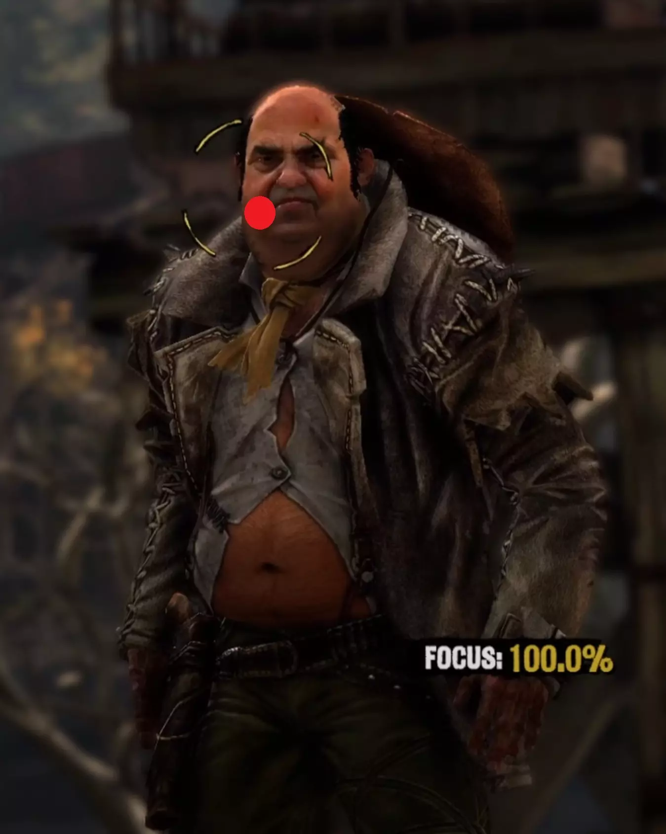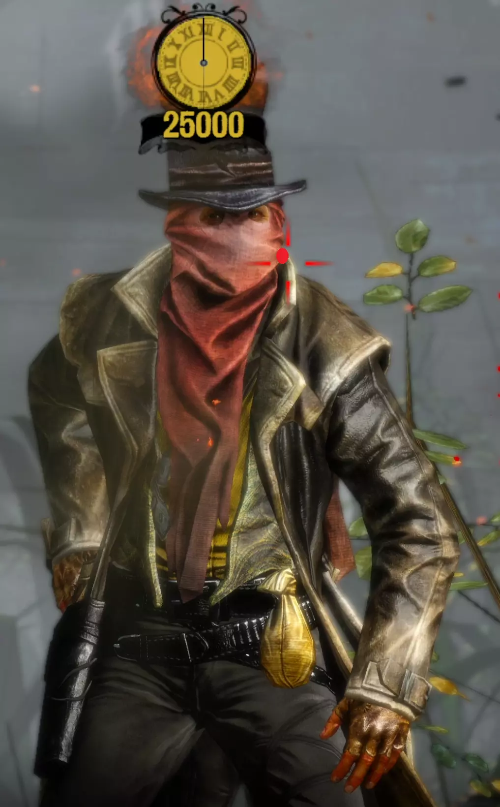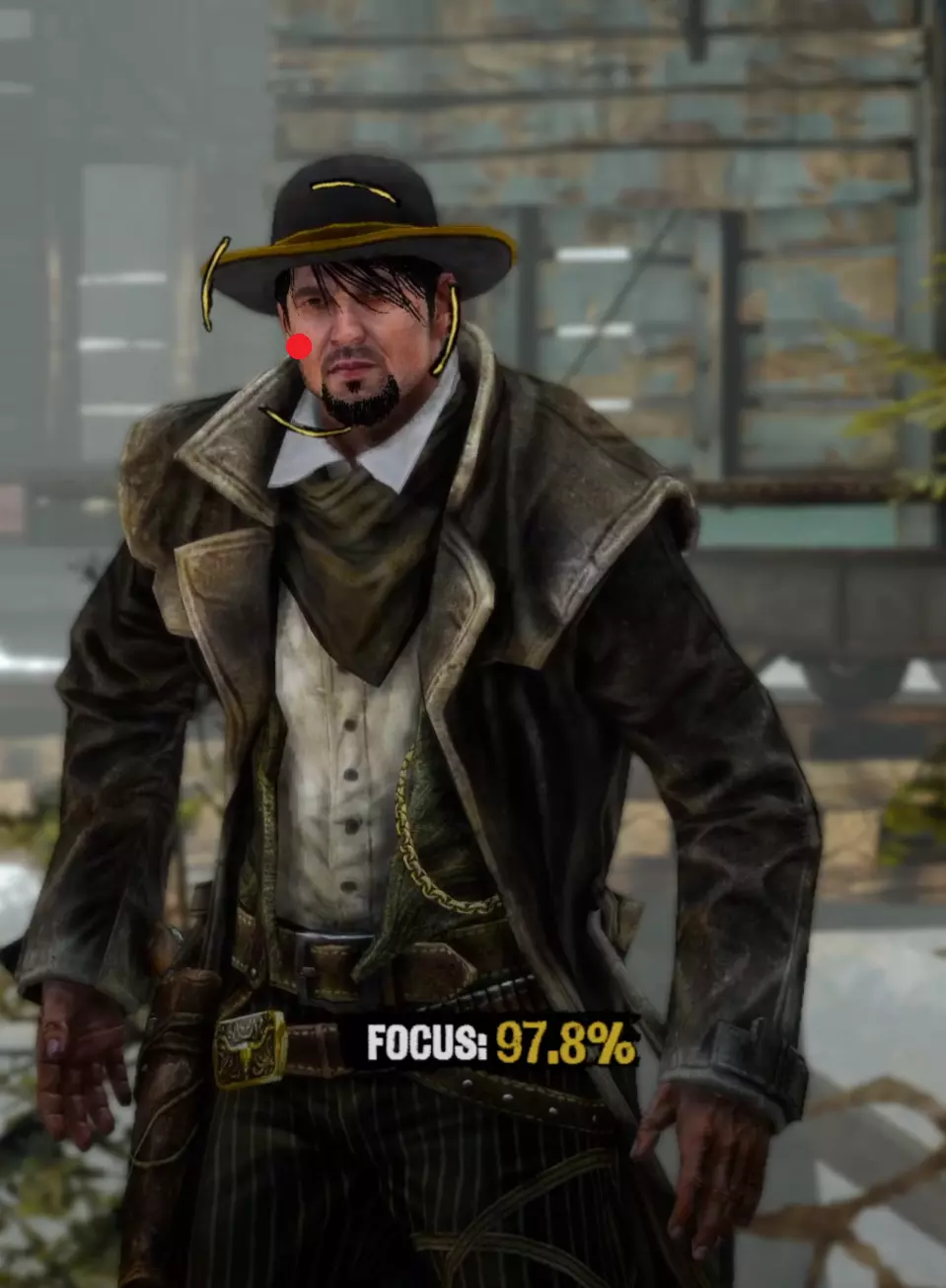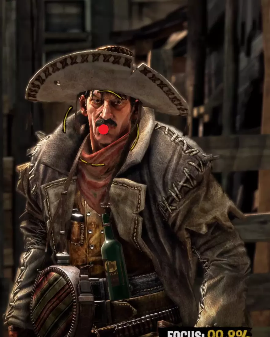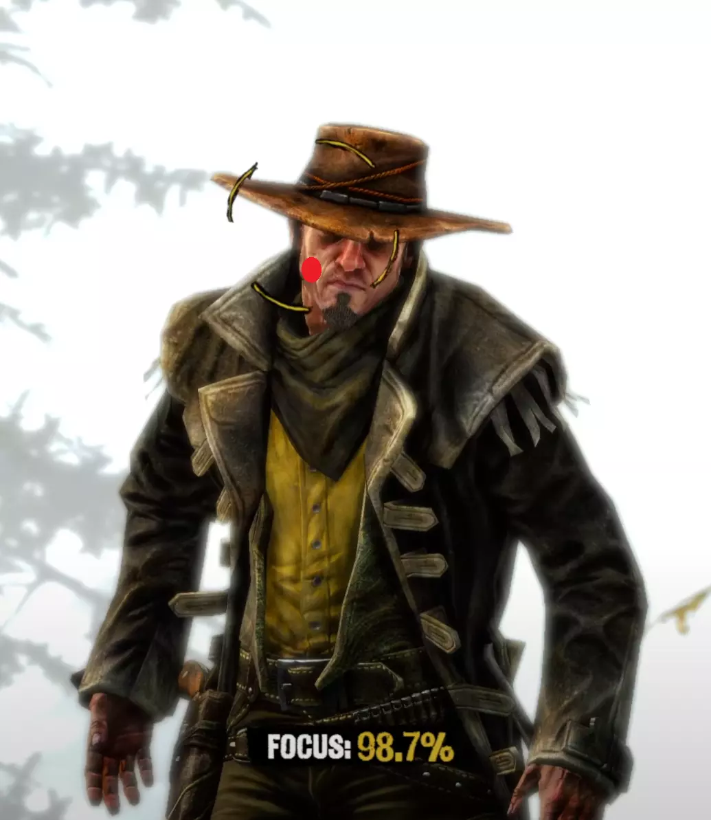 Aim Generally you want to keep your aim (center of the target circle) over the body of your opponent until he is done with his movement pattern, then move it up to his head. I find it is also generally better to be closer to the very left side of the cheek than closer to the middle of the head when you draw because of the way drawing moves your screen. It's annoying but doing this will often stop giving you focus right before you draw, so try to keep your target circle fully yellow yet as close to the left as possible. I am fairly certain that pre-draw target circle yellowness is a factor in whether you get a headshot or not. Having your target circle less yellow also makes the draw animation move much faster and thus makes it harder to manage. For Henry Plummer, the two Daltons, and the Sundance Kid and Butch Cassidy fight, use the body to get to 85%+ focus then move to the head. Most opponents only have one movement pattern, so you can definitely memorize the way each opponent walks and take advantage of that. Old man Clanton is an example of an enemy with two movement patterns. After enough practice, you'll be able to tell which one he is using by the time it matters, and muscle memory it out. Other opponents with two movement patterns may be more tricky as the differences are subtle. Bob Ollinger/Jim Reed: I think these two are the only opponents where it is optimal to keep your target circle in the middle of their head as opposed to left. Their heads move slightly to the right when they draw, so it more or less balances with the way the screen moves. Old Man Clanton: He tends to draw relatively fast after he stops moving, so it's best to have your target circle tracing his head before he stands still. Curly Bill: I don't think it's really worth it to go for the left side of his face because of how screwy his hitbox is and how aiming over the left side of his head makes you lose focus. It's better in my experience to aim around the chin/lips. Henry Plummer: Henry's hat counts as part of his hitbox. This is actually huge and gives you way more to aim at. If you want to, you can aim a little higher, around the monocle. I don't really do this out of habit because my spot works just fine almost always, but it definitely gives you a lot of room for error. Bob & Grat Dalton: Grat's draw pushes his head down slightly. You can account for this by putting your target circle a little closer to his chest. You can then dodge left and very quickly hit Bob in the very right side of the head. The best score I've gotten on this fight is -85. Faster IS possible, but -85 is about as good as you can reasonably expect without exploiting some hitbox jank. Here I found out that you can actually aim OFF Bob's head. Idk how reliable or viable this is but it's happened to me once. Here's an example: Sundance Kid and Butch Cassidy: For this fight it is as if you're fighting two Henry Plummers. You can draw on which ever one ends up being the one looking at you, fire and instantly hit the switch target key and take a short moment to aim for the other opponent. You do not need to wait at all between clicking and pressing q/e. If you had a good draw, you timed your crosshair, and your aim was right, the bullet will go where it needs to go and the first opponent will die offscreen. When one opponent looks away, the other opponent is guaranteed to look at you next. If one looks away, look at the other opponent and hold it until he looks at you then looks away, then switch again and repeat until draw. If you're feeling lucky and need to go for a particularly high score to beat your PB, hit the switch enemy key and slide your mouse and click almost instantly right after the camera stops, but not instantly - just within a couple milliseconds. This is a VERY slight mouse movement. Your crosshair will drag across the second opponent's head but you will not really be able to gauge it yourself, you'll probably just have to trust where your crosshair is, and not micro-correct it yourself because that usually ends with a miss and a ruined run. You will need to drag to the right no matter which opponent you're switching to, because no matter who you're switching to, your crosshair will end up on the left of their head. The timing between the two is slightly different, but you'll always be dragging right. I have examples for each: Here's an example of a dragshot switching to Butch: In these videos, I'm pretty sure the mouse movement happens during the switch, which is why it looks like I stop directly on their heads. This actually SHOULDN'T be necessary if you're getting a good reaction time (under 0.225). In this clip I get perfect even though I overshoot the dragshot and re-adjust. The dragshot is a nice tech but I think it's only making you go faster than necessary and not gaining you more points, unless you know you got a slow reaction time. Here are images of where I generally try to keep the center of my target circle on each opponent: