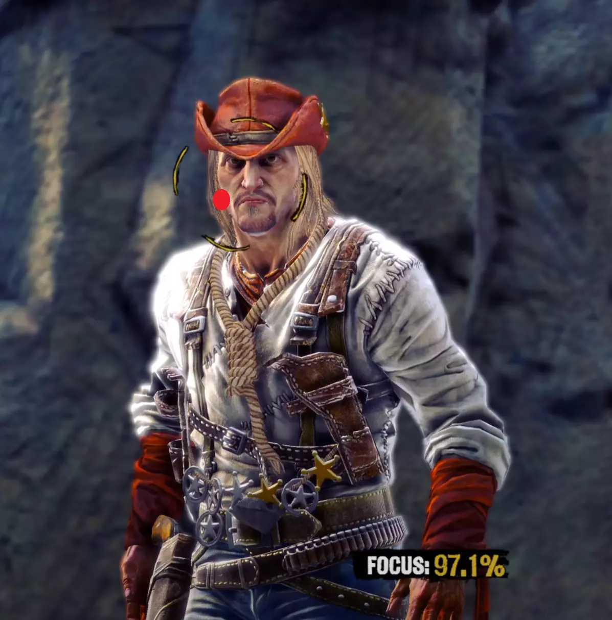 行刑者阶段包含鲍勃与格拉特之后的所有对决。 说真的,扁鼻子和吉姆·里德的对决就像是走个过场。而杰西和比利则很容易打乱玩家的节奏并导致失败。这两人的难度会有明显提升,需要玩家格外留意,尤其是比利。经过练习后,桑德斯和布奇通常会变得非常简单。有时他们会长时间对视,让你难以积攒专注力,不过这几乎就是他们最大的威胁了。他们通常需要很长时间才会拔枪,所以你有充足的时间准备,只要保持冷静,得分就不会有问题。 专注力 对决模式: 专注力是获得高分的关键要素。要获得专注效果,你需要将准星圆圈调整为黄色并对准对手身体或头部的中心,然后快速左右晃动鼠标,就像在对手身上画图案一样。我们称之为“决斗模式”。
