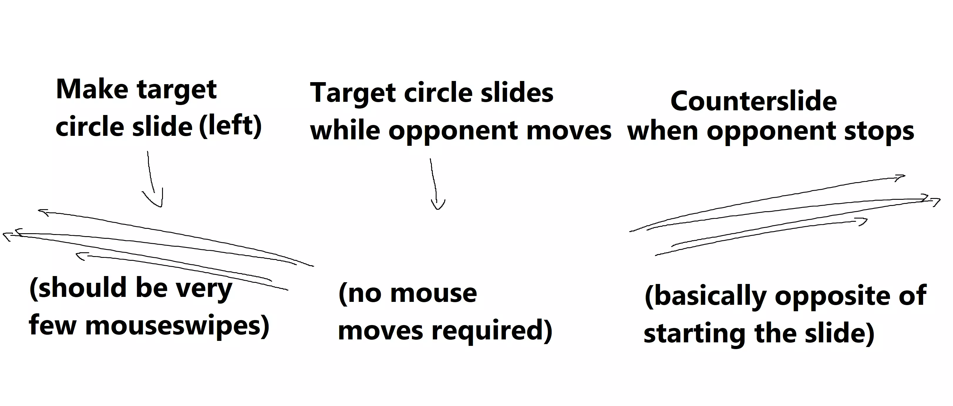 滑动与反滑动: 当对手移动时,你必须迫使目标圈随其滑动,并继续以较低强度对其执行对决模式,这样你仍能获得专注值,但目标圈不会停止滑动。当对手停止移动时,你必须从相反方向开始加快对决模式的强度,以使其停止并继续获得专注值。以下是你应如何进行滑动和反滑动的示例,这是在较弱对决模式基础上的额外操作。理想情况下,你无需停止对决模式来进行滑动,只需减慢其速度即可。