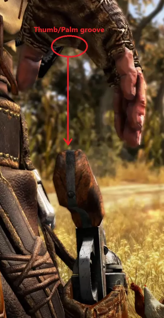 速度 速度虽然不如专注力重要,但对于获得高于1/12的评分仍然至关重要。速度是两者中更容易掌控的一项。你应该始终能看到赛拉斯(Silas)食指和中指的指尖,但不要太靠左。你要尽可能让赛拉斯食指和中指的内侧贴近枪支,同时又不降低速度。我发现,通常你只需将赛拉斯拇指和其他手指之间的凹槽直接对准枪支握把上方,然后以特定节奏点击A键,通常就能达到100%的速度或接近这个数值。我还注意到,在决斗后期,利用赛拉斯手指和手掌其余部分之间的凹槽与握把角落对齐会很有帮助。经过足够的练习,决斗中的这一要素几乎可以完全置于你的余光之中。 早期决斗姿势:
