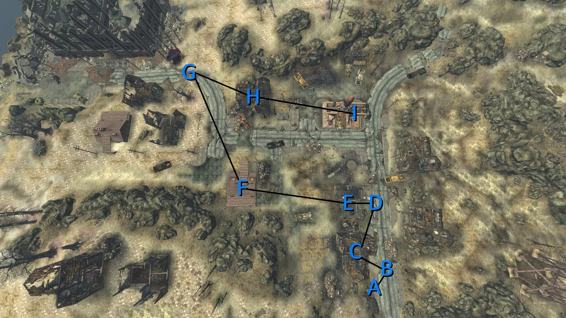 现在你终于清空了背包,囤积了足够的瓶盖和有用的装备,那就动身返回 crater 边补给站吧。当你到达门口的斜坡顶端时,转过身继续向上前往水处理厂。 水处理厂的操作员沃尔特要么在外面休息,要么在里面忙碌工作。和他交谈,问问你能为小镇帮上什么忙。他会告诉你有三根漏水的管道需要修理,这就需要用到 30 点修理技能。主动提出帮他修理管道,具体每根管道的位置以及最快路线可参考下方地图。