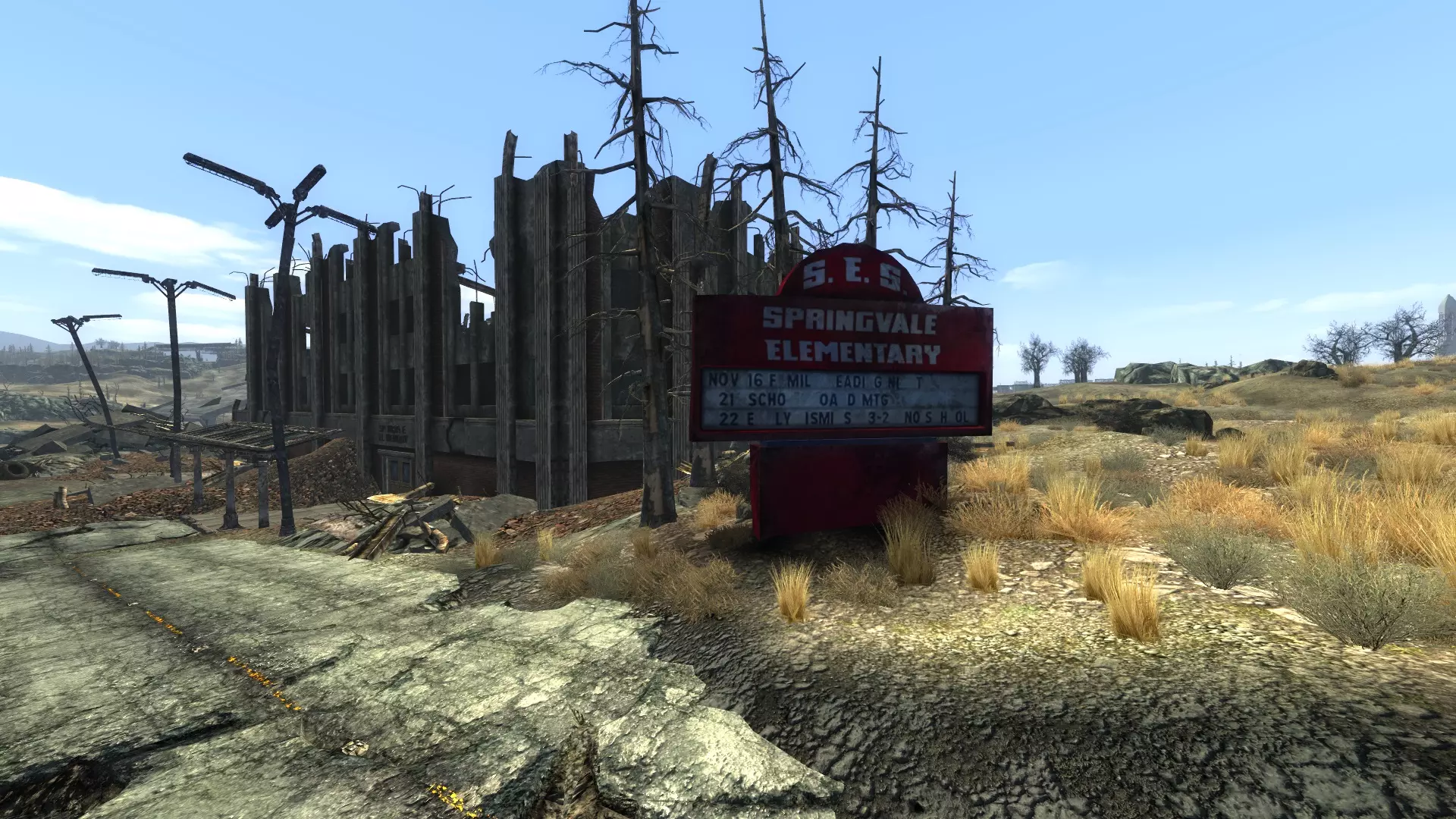 这会使希尔弗变为敌对状态,让你可以击杀她且不会损失道德值,所以解决掉她并搜刮她身上的400瓶盖、各种药剂和其他物品。她的房子里还有更多贵重物品可以搜刮:厨房的木箱里有一瓶纯净水,房间另一边有一个急救箱,其下方还有一些废金属——这些废金属在你到达兆吨镇后会派上用场。 另一个房间里有一个装有几根发夹的柜子,柜子下方的地板上有一些弹药,她的床附近还有一些“疯狗”、“喷射”和一盒香烟。洗劫完希尔弗的住所后,你可以出门前往学校。 G - 春之谷学校