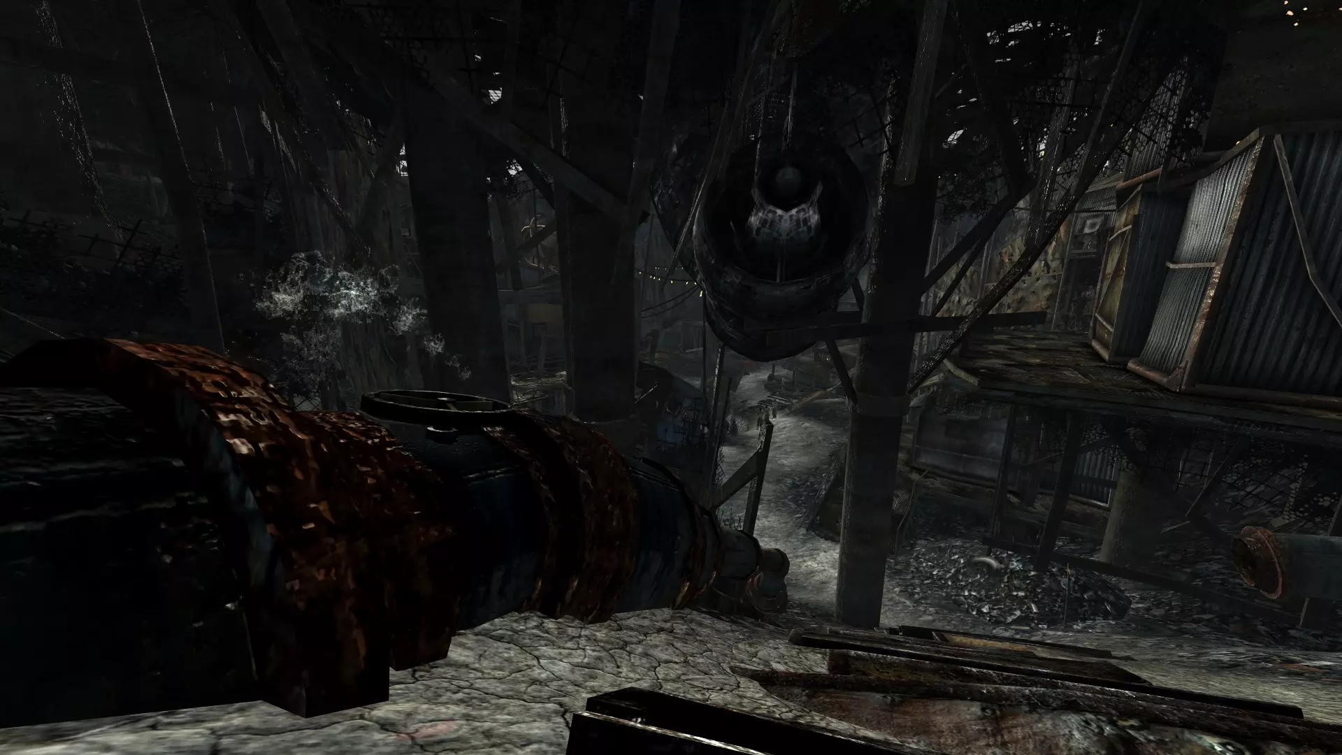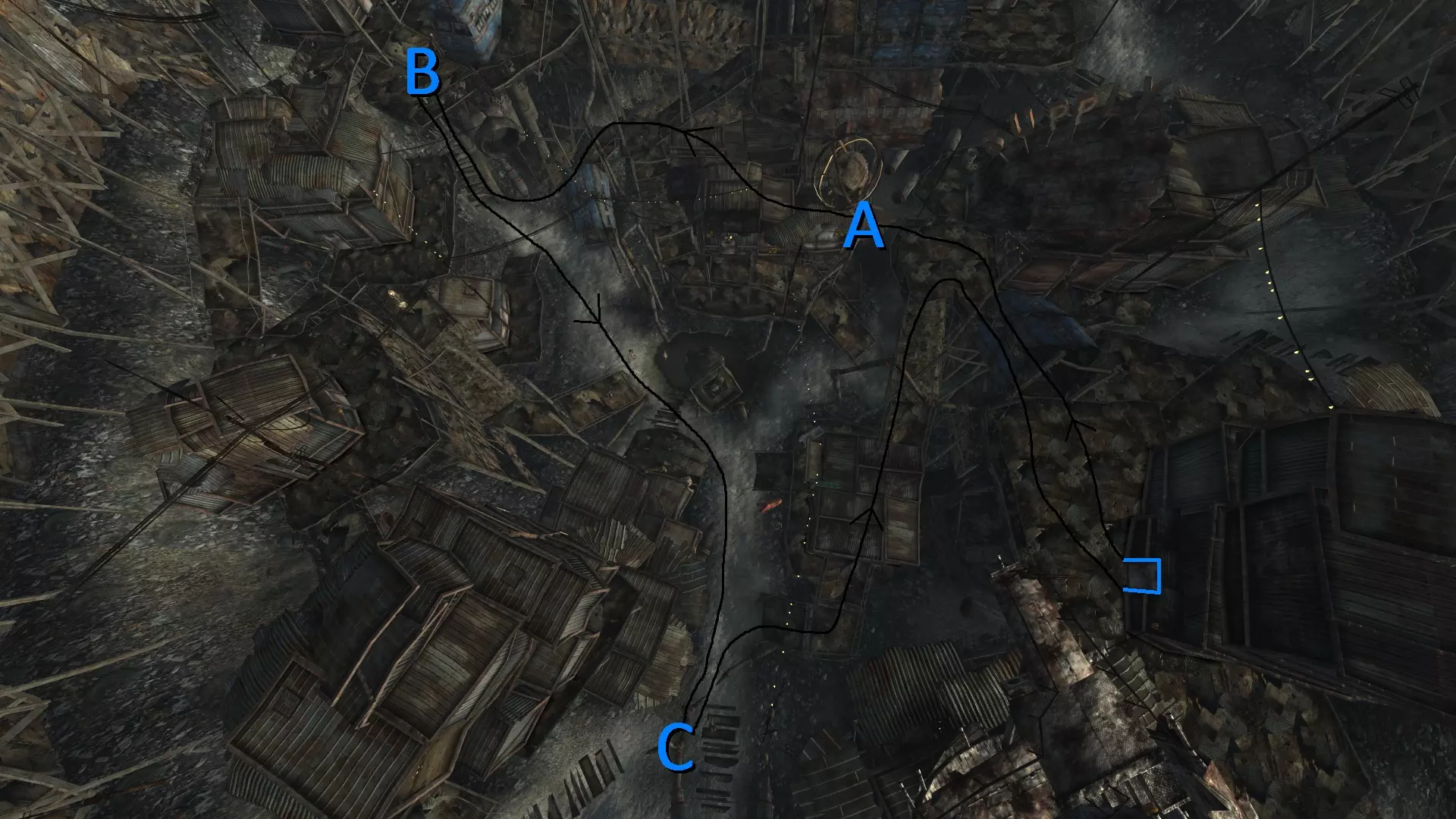A - 从斜坡下来,走向“弹坑边补给站”的门,然后直接向左转,跳过栏杆,落到屋顶上。