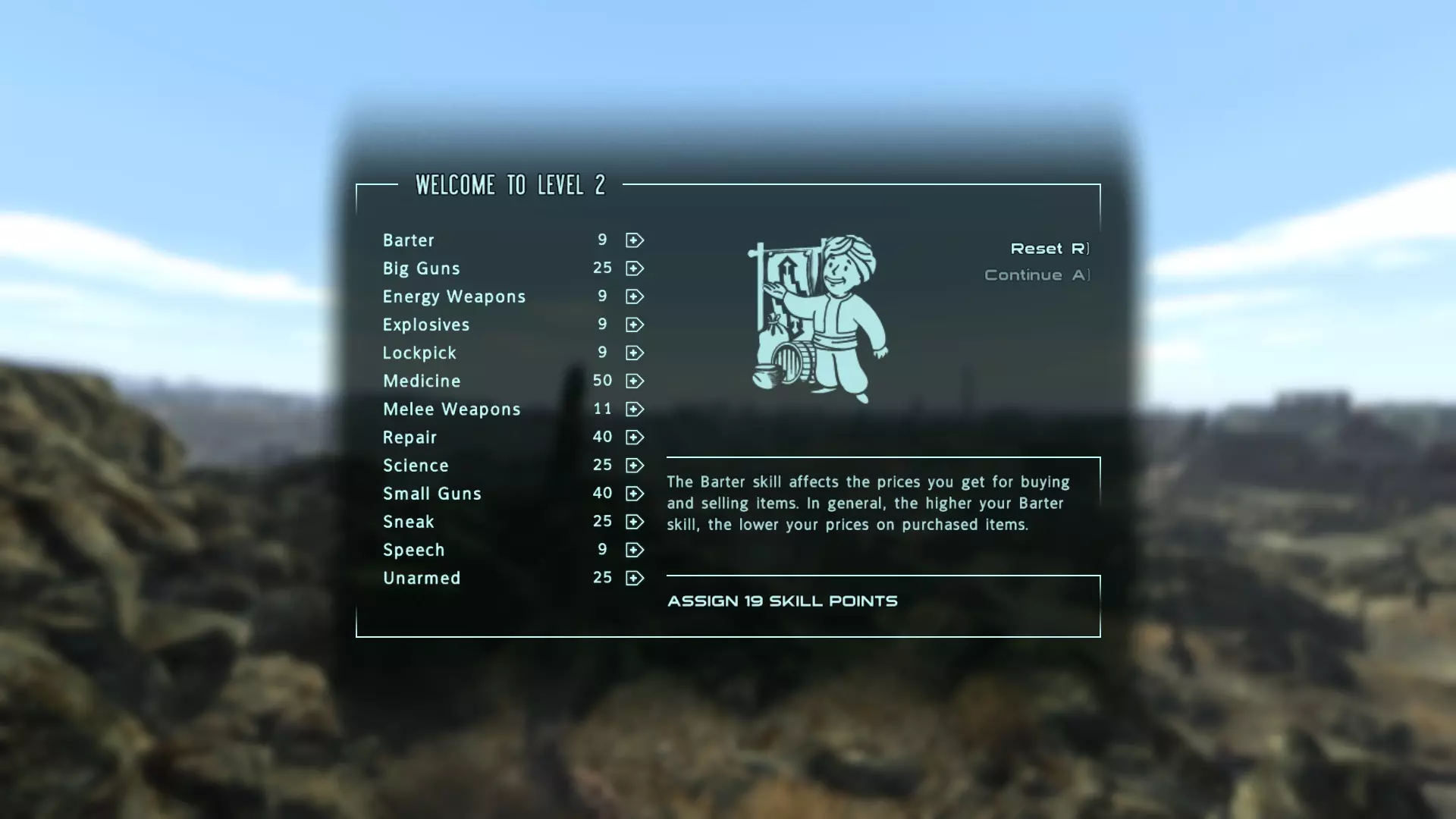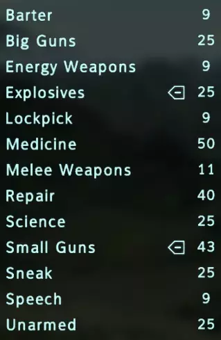 在被刺眼阳光灼伤双眼,并首次短暂瞥见废土世界后,升级界面会打断你的进程。首先,确保将“爆破”技能提升至25点,“修理”技能提升至30点。如果还有剩余点数,你可以选择优先培养哪些主要技能,不错的选择包括“小型枪械”“医疗”和“修理”。我将大量点数投入“爆破”技能,使其达到25点,剩余点数则加给了“小型枪械”,因为我的“医疗”技能本就相当高。“小型枪械”是个很棒的初始技能,因为你会发现并使用大量受该技能影响的武器。