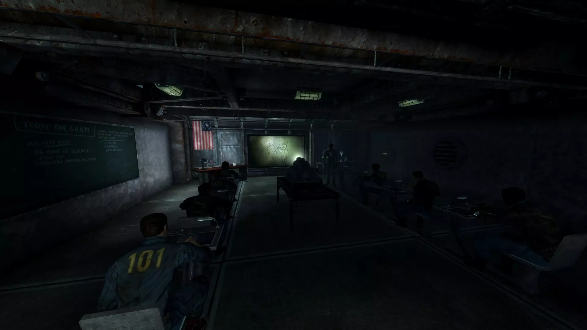在你父亲告诉你关于“废土最强之人”测试的事情后,记得低头看看他的书桌,拿起“医学摇头娃娃”,它能永久提升你的医学技能10点。 在去上课的路上,你会看到布奇和他的跟班在欺负阿玛塔。去教训他一顿,挥拳打他几下,直到他退缩并走进教室。这样做你会获得 karma,这能有效抵消你很快会失去的 karma。除了某些同伴需要特定的 karma 值才能说服他们加入你的旅程外,karma 并不是那么重要。 当你自己进入教室时,布罗奇先生会向你打招呼。如果你是第一次玩《辐射3》,你很可能会想参加这个测试,因为第一次玩的时候感觉相当有趣。如果你之前已经参加过很多次测试,可以通过说……来跳过测试。
