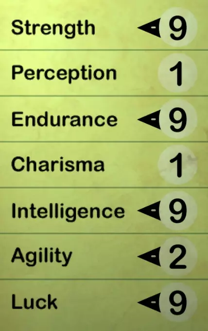 一年后,在违抗父亲并挣脱婴儿围栏后,你可以通过阅读地板上的“你很特别”(You’re S.P.E.C.I.A.L.)书籍来选择你的S.P.E.C.I.A.L.属性。你可以逐页翻阅,也可以直接跳到最后设置属性。《辐射3》中的一些 perk 有特定的S.P.E.C.I.A.L.属性要求才能解锁,但由于我们纯粹关注各属性在一般游戏中的实用性,建议将感知(Perception)和魅力(Charisma)设为1,耐力(Endurance)和智力(Intelligence)设为9。 较高的感知属性会增加敌人在罗盘上显示的范围,但这几乎没什么用,因为你完全可以用自己的眼睛观察远处。魅力属性稍有用处,它能提高通过对话检定的概率,从而获得少量经验值、瓶盖或一般信息。但这不值得投入点数,因为这些都能通过其他方式轻松获取。 而耐力和智力则实用得多。每点耐力可增加20点生命值以及2%的毒素和辐射抗性,因此在游戏初期投入9点到该属性上会带来显著提升。智力属性在每次升级时能提供额外的技能点,由于游戏仅有30级,且有大量技能需要提升,你会希望获得尽可能多的技能点。 永远不要将10点投入到单一的S.P.E.C.I.A.L.属性中,因为在游戏后期你会找到能将每项属性各提升1点的摇头娃娃。如果你现在为某项属性投入10点,之后又找到对应属性的摇头娃娃,那么摇头娃娃带来的加成将会被浪费。 运气是个值得投入点数的可靠属性,它能提高暴击几率,还能小幅提升所有技能。与敏捷相比,力量是更适合点满的属性,因为它能增加你的负重上限和近战武器伤害,而敏捷仅能提升行动点数。 所有属性都会影响对应技能的初始数值,例如,力量提升徒手和近战武器技能,感知提升能量武器和开锁技能等等。不过最好不用在意这一点,因为你总能在后续升级时提升那些技能,同时还能保留S.P.E.C.I.A.L.属性带来的独特加成。以下是我创建新角色时的推荐加点方案: