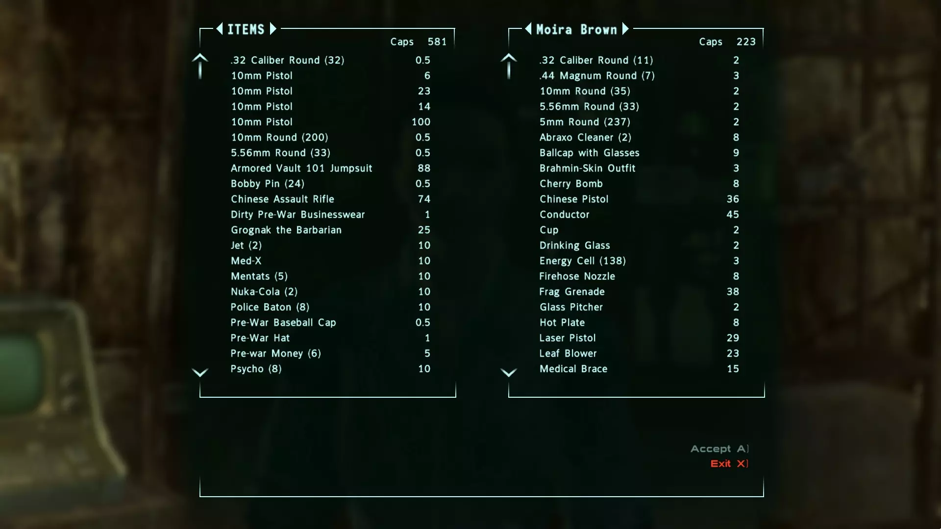 这项任务可以直接在兆吨镇完成,所以前往镇外,靠近原子弹的地方。站在受辐射的水中并同时饮用那里的水。这会让你的辐射值迅速达到600,并立即完成可选目标。该任务的可选目标在你交任务时能从莫伊拉那里获得更多战利品,所以务必完成它们。 被诊断出严重辐射中毒后,跑回莫伊拉处,她会进行一些测试,然后治愈你的疾病。完成本章的这项任务后,她会给你一些消辐宁和抗辐宁;而完成可选目标后,你将获得“辐射再生”perk。拥有此perk后,当你的辐射值达到400或以上时,受损的肢体将自动再生。现在你已经完成了第一章的第一个任务,莫伊拉会问你接下来想做哪个任务。选择去超级超市获取食物,因为它比雷区的任务更近。 4. 交易 概述 - 出售无用物品 - 购买有用物品 - 将物品存放在房子里